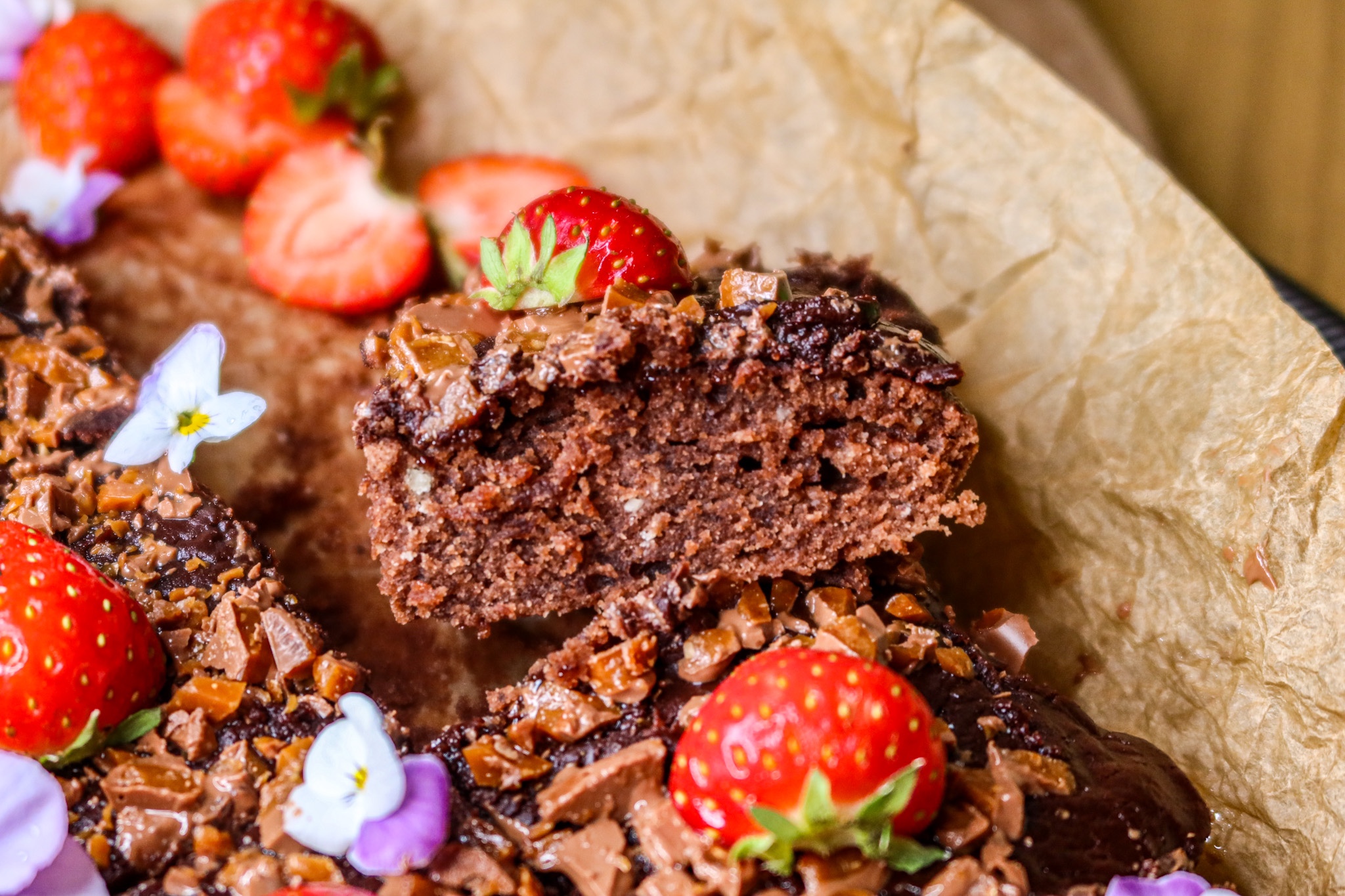 6) Skär upp kakan i bitar och dekorera med hackad dajm, jordgubbar och ätbara blommor. 🍓🌸