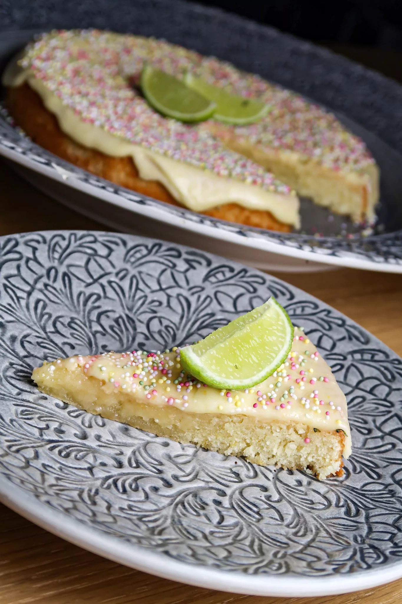 5) Glasyren gör du genom att smälta smöret. Rör ihop med citronsaft, vaniljsocker, florsocker & äggula. Den kommer vara rätt tjock. Bred på den på kakan och avsluta med lite strössel och limeklyftor.