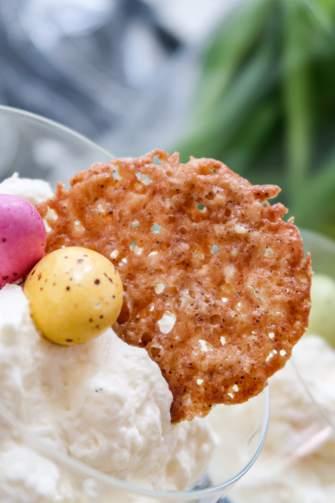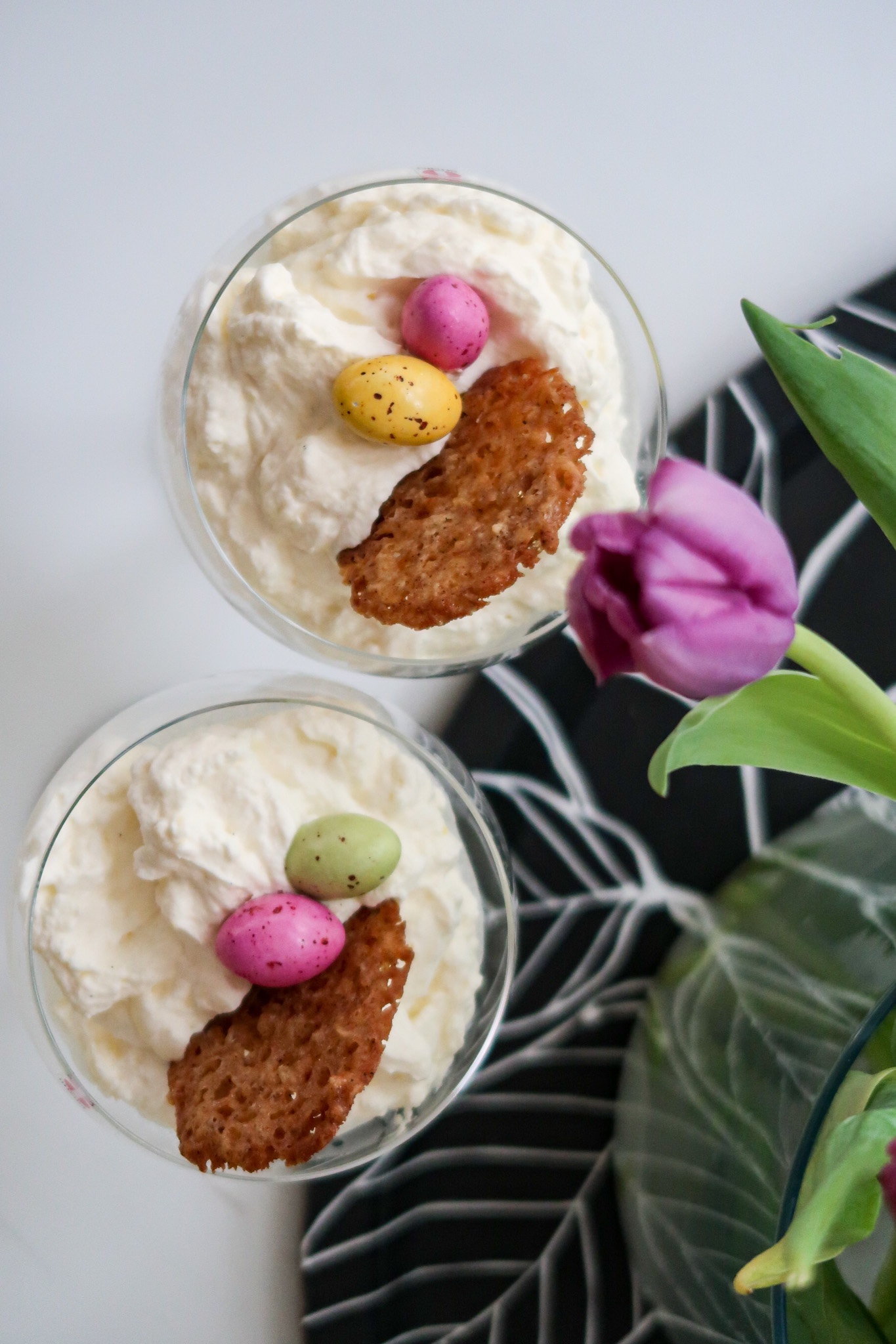 2) Mousse: Häll i grädde, rivet skal av citronen och florsocker i en bunke. Vispa grädden så den blir fluffig. I en annan skål (med rengjorda vispar) vispar du äggvitan så den blir fast (testa genom att hålla skålen upp och ned, det ska inte rinna ut). Blanda i äggvitan samt pressa i saften från citronen och rör om försiktigt så allt blandats ordentligt med en slickepott.