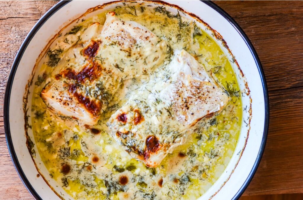 - Vänd torsken, häll i buljongen samt en klick smör och grädden. Låt puttra i ytterligare 4-5 min.