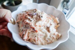 - Ha sedan i creme fraiche, majonnäs (recept på hemgjord HÄR), dijon, honung och salt & peppar.