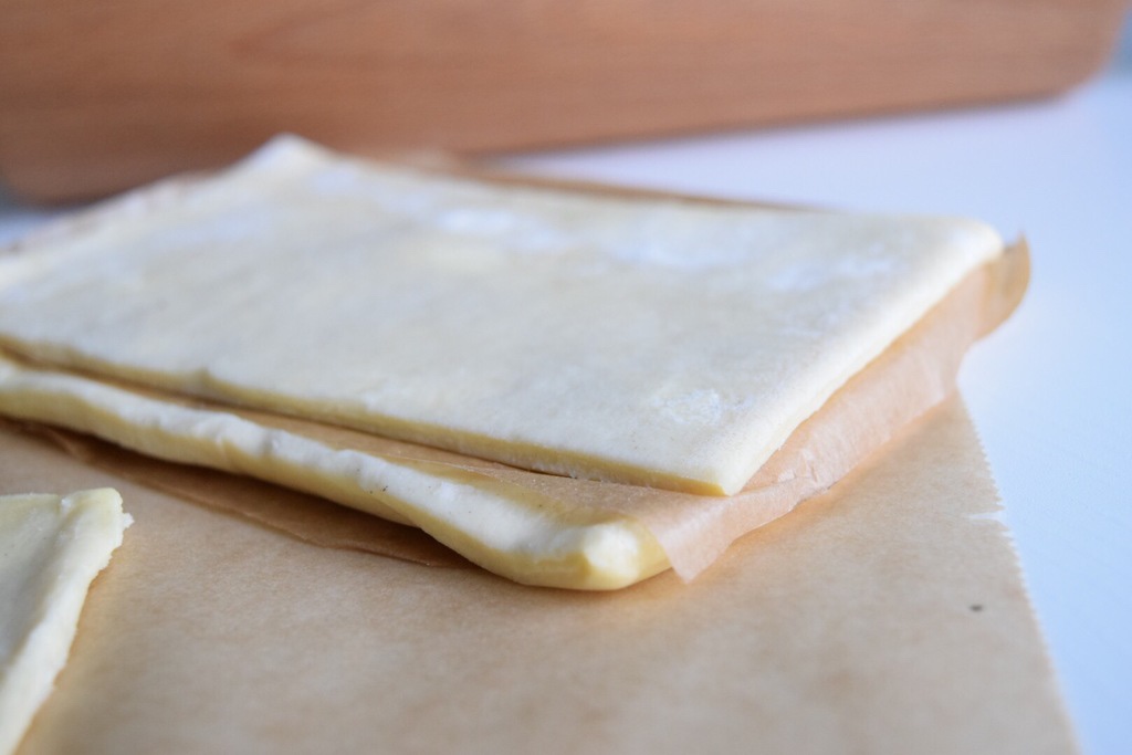 4) Kavla ut på nytt till samma rektangel och vik om på samma sätt igen. Kyl, kavla och vik en sista gång. Alltså kavlar och viker du degen totalt 3 omgångar med kylning emellan. Avsluta med att kavla ut degen till en ännu större platta som är ca 3-4 mm tjock. Skär i dm stora rutor och frys sen in med bakplåtspapper emellan. Så har du din egna smördeg färdig i frysen!