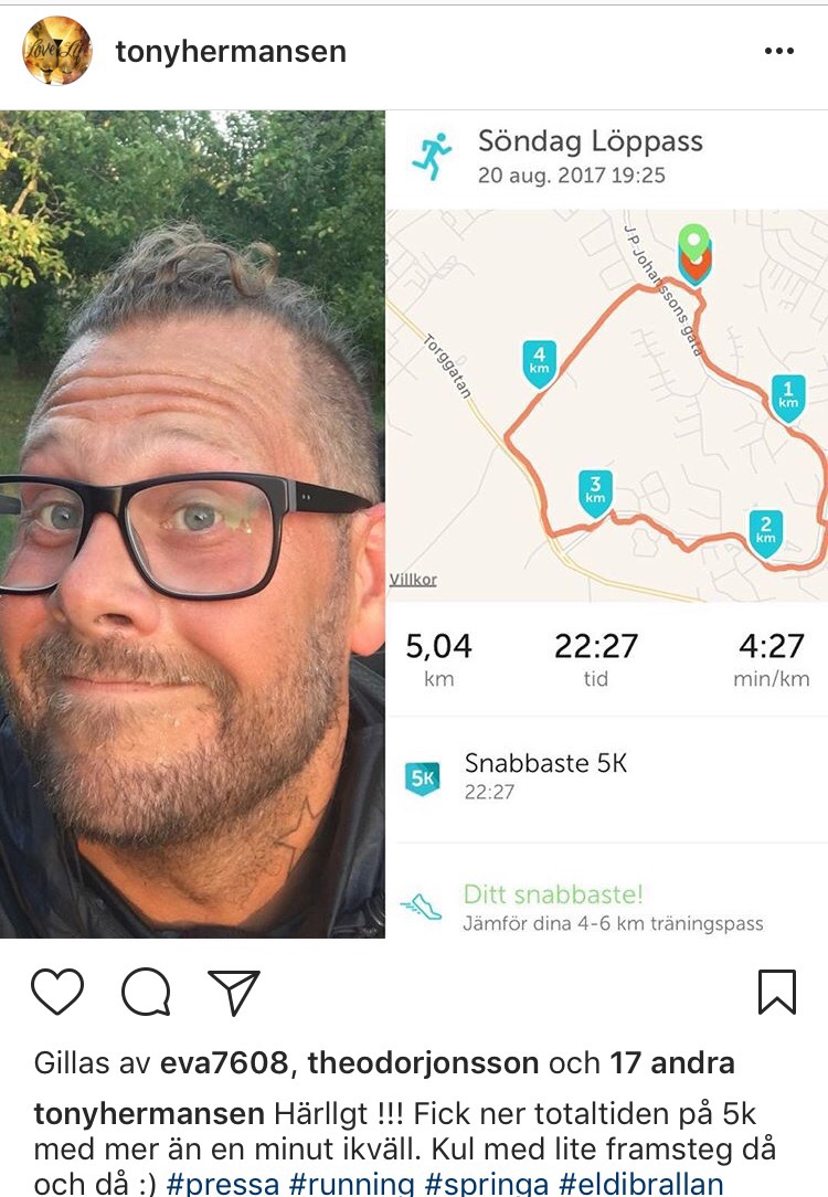 Jo men så har man liksom världens jäkla hurtigaste man. Han ba: ”Jo men jag drar ut och springer här efter vår arbetsdag” å så drar han av ett personbästa helt jäkla lila i fejset. Kom hem här och flåsade som ett havande ånglok.