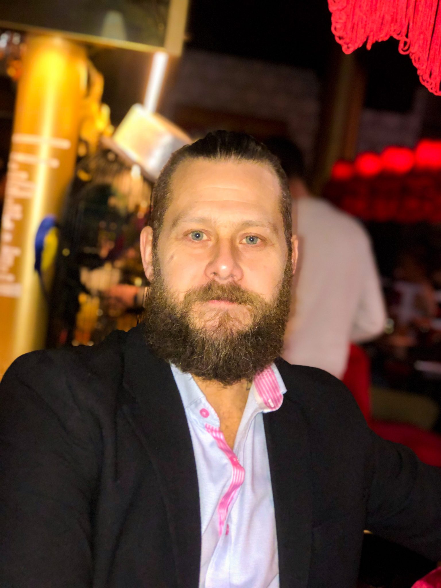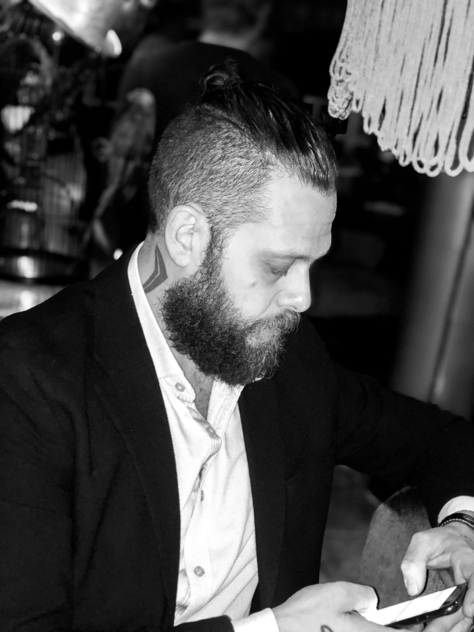 Tony djupt fokuserad i sin beställning av maten. Man beställer allt via en app i telefonen vilket är superfiffigt. När det sedan är klart att hämta så får du ett litet pling i telefonen.