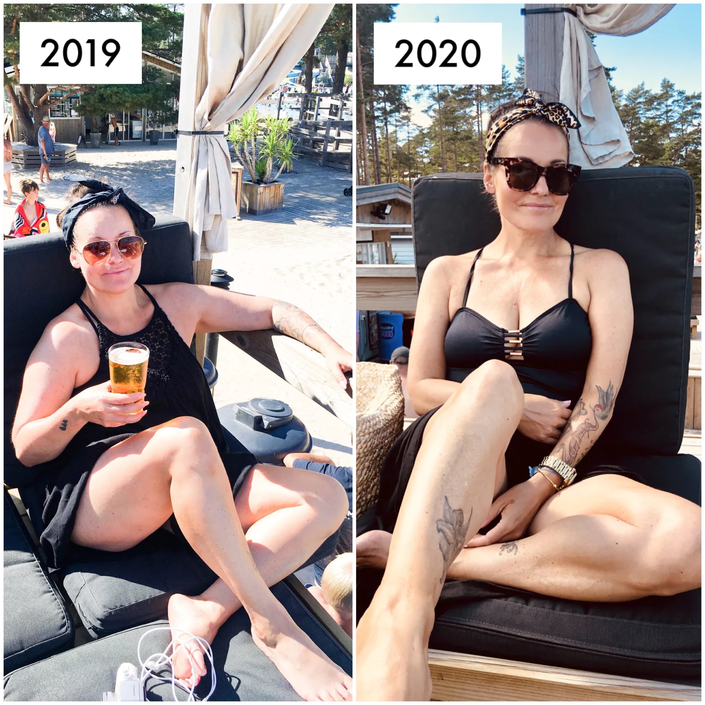 Det skiljer mycket smärtor i magen och många kilon på dessa bilder. Jag minns exakt hur det kändes i min mage på 2019 bilden. Jag visste också att ölen skulle göra det ännu värre men att jag tänkte att det ju för helskotta var semester och att det var en smäll jag fick ta. Det var väldigt mycket så då. Det var en vana att alltid ha ont någonstans i magen för mig. Jag trodde nog att det var mitt ”normala” så att säga.
