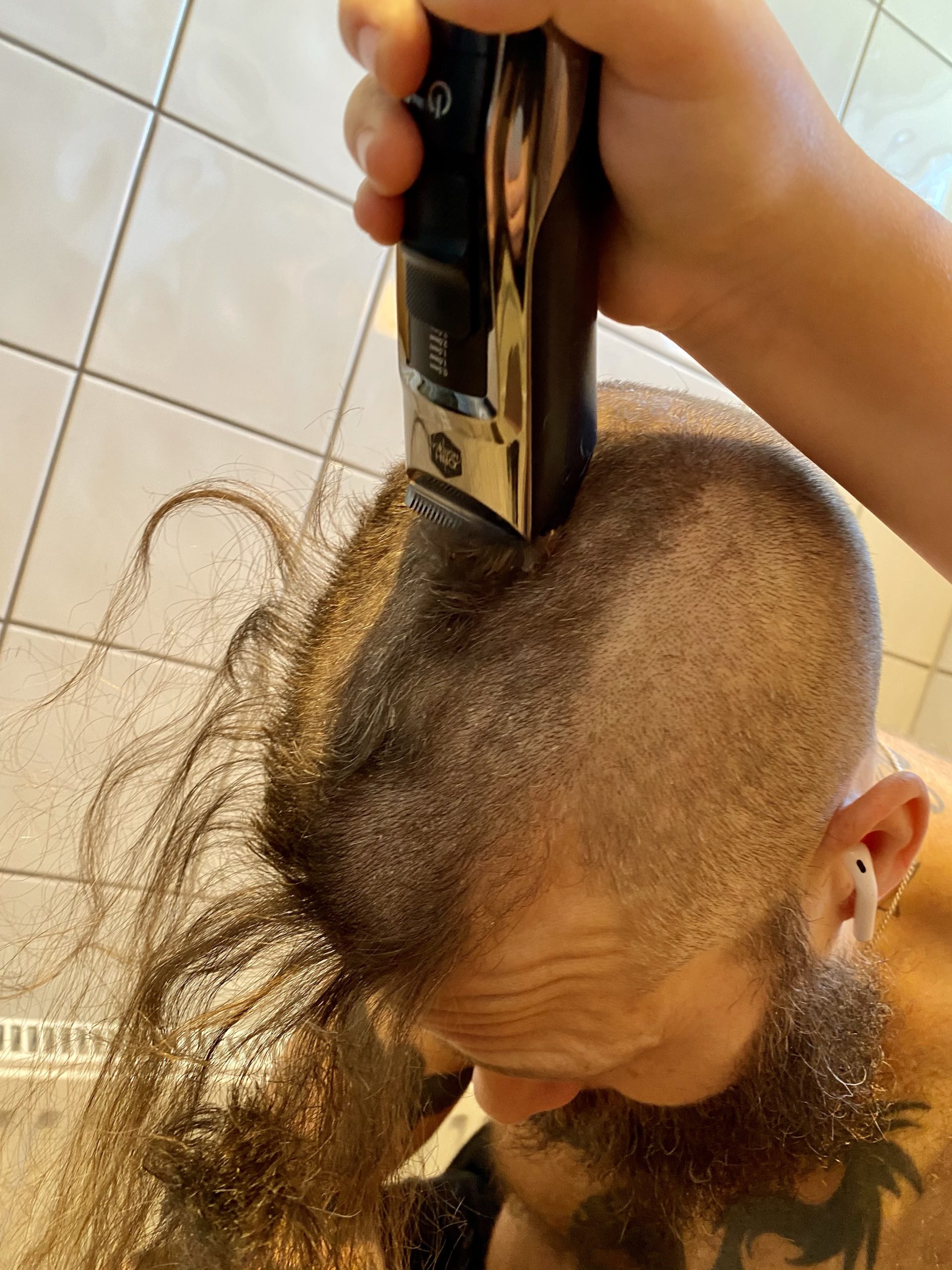 Haha! Såg rätt kul ut innan allt lossnade. Milo tyckte nog att det var rätt kul att få raka bort allt även om vi båda tyckte det var väldigt ovant igår. Varje gång man såg honom så hajade man till. Han får sina ryck att raka av sig håret ibland, rätt vad det är så kapar han skägget också.