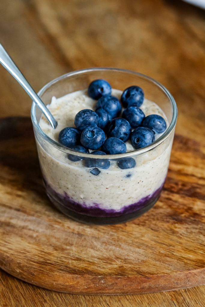 - Blanda havregryn, chiafrön, mjölk, vaniljpulver och ev. kanel. Häll blandningen över blåbären.