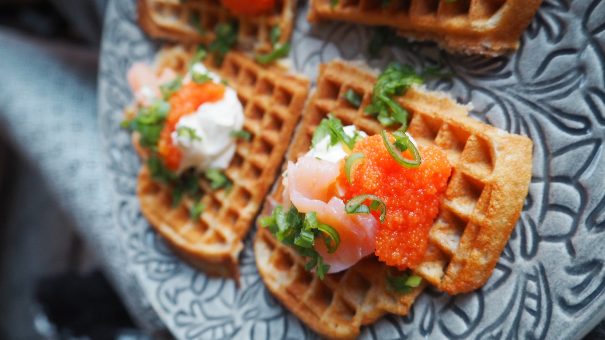 Jag gräddade dinkelvåfflor på ett recept jag hittade. Blev grymt bra! Förberedde både för matiga våfflor och de göttiga. De matiga med rökt lax, löjrom, creme fraiche och salladslök var så inibängens goda! Efterrättsvåfflor, ja men det är ju ALLTID gott!