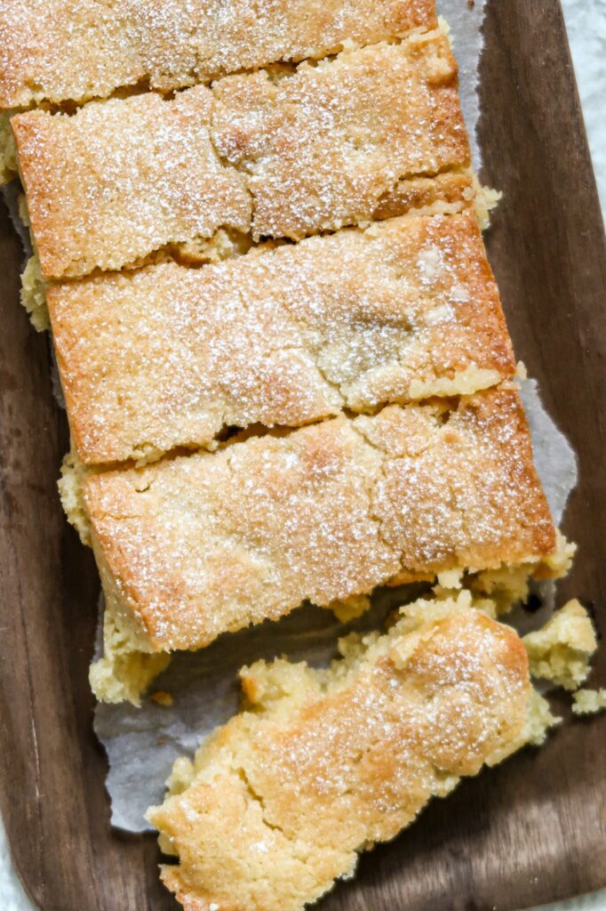 4) Grädda i ca 20 minuter. Den ska vara lite lite kladdig i mitten när du känner med sticka. Pudra med florsocker uppepå.
