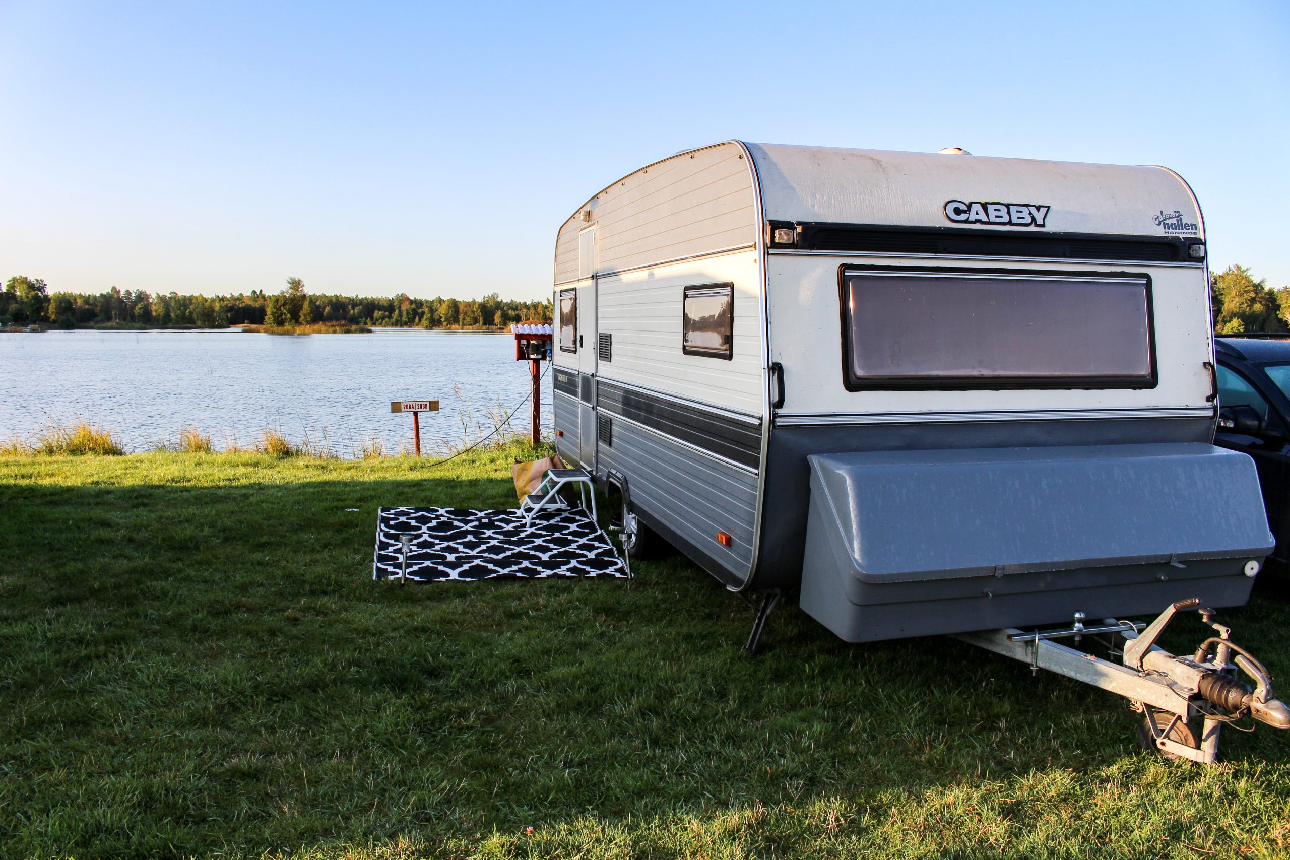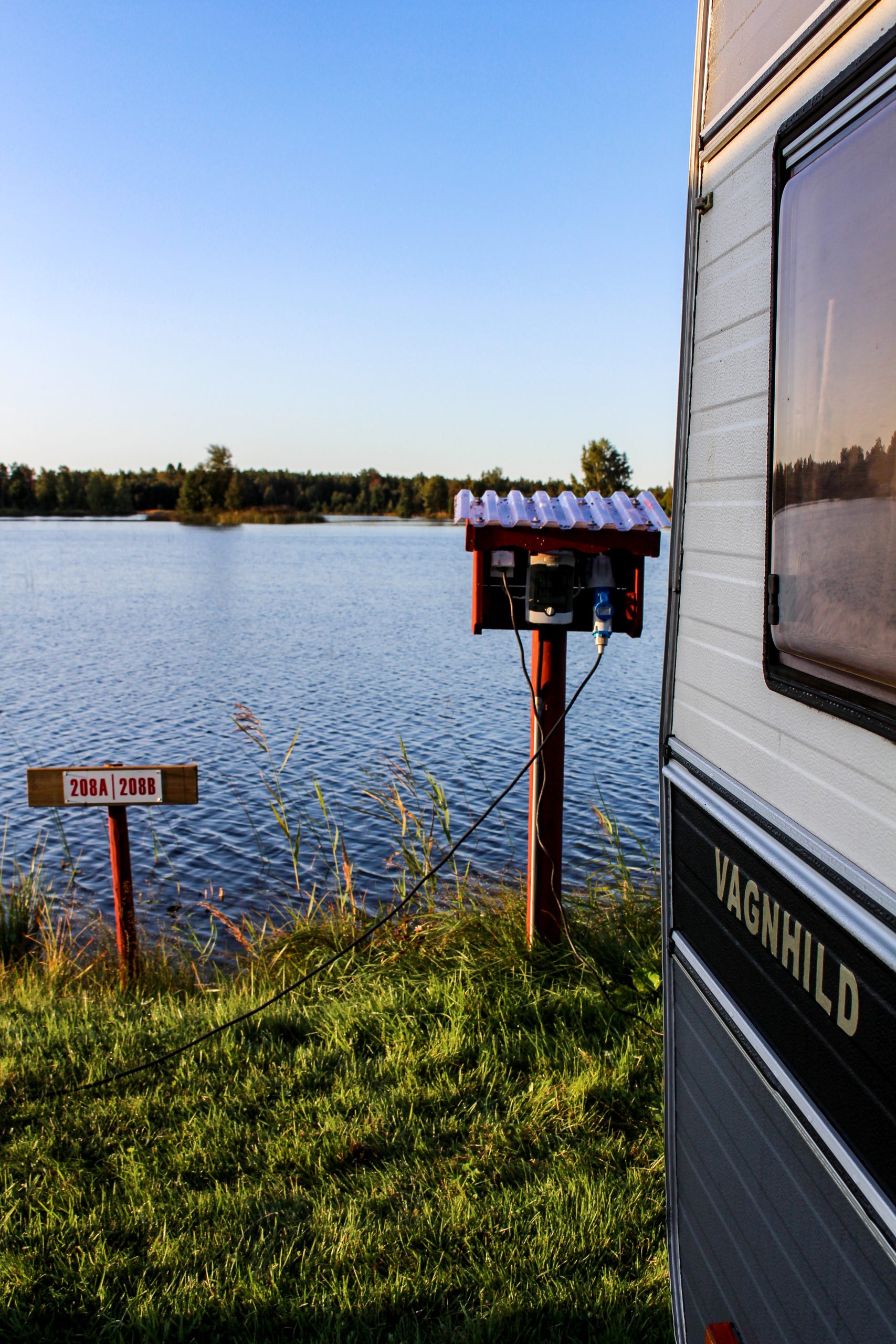 Kolla så mysigt det ser ut, det här är verkligen magiskt vackert. Vi ligger ute på en holme som omger sig helt av vatten. Sitter jag här inne i husvagnen så ser det ut som vi ligger på vattnet och guppar, så härligt.