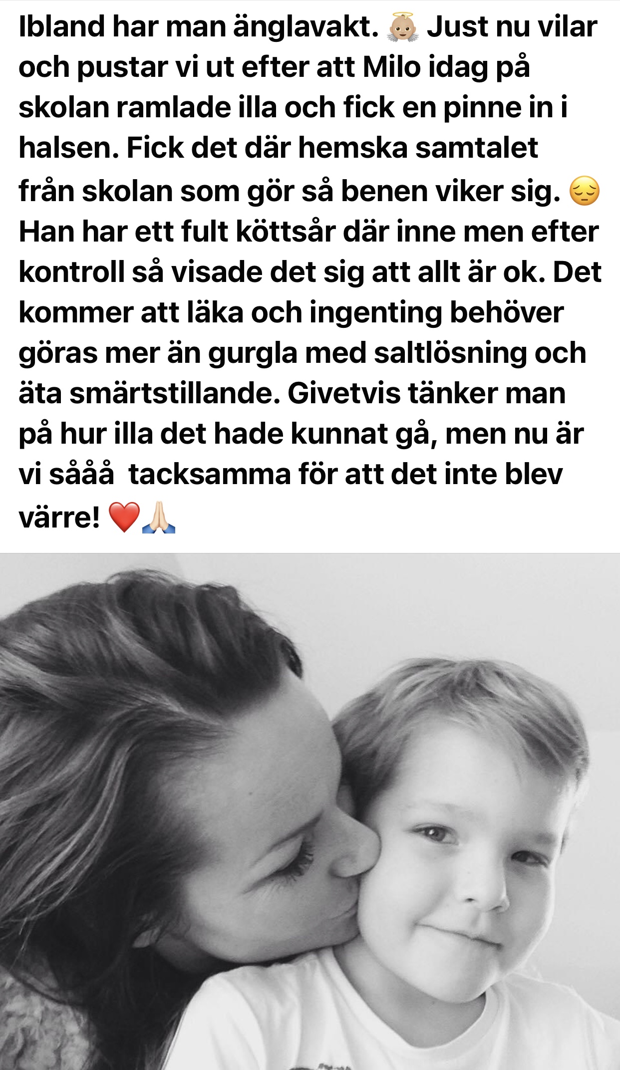 Jag minns exakt den här dagen. Så otroligt hemskt med det där samtalet från skolan och hjärtat i halsgropen. Allt gick tills slut bra och Milo hade en oerhörd tur att det inte gick värre än vad det gjorde. Han hade nog änglavakt. Han hoppade ned från en hög avsats och föll så illa så att en rot med en avsågad kvist for rakt in i hans hals. Alltså från munnen och ned i halsen. Åh Gud, kan knappt skriva om det för det är så otäckt att tänka vad som hade kunnat hända.
