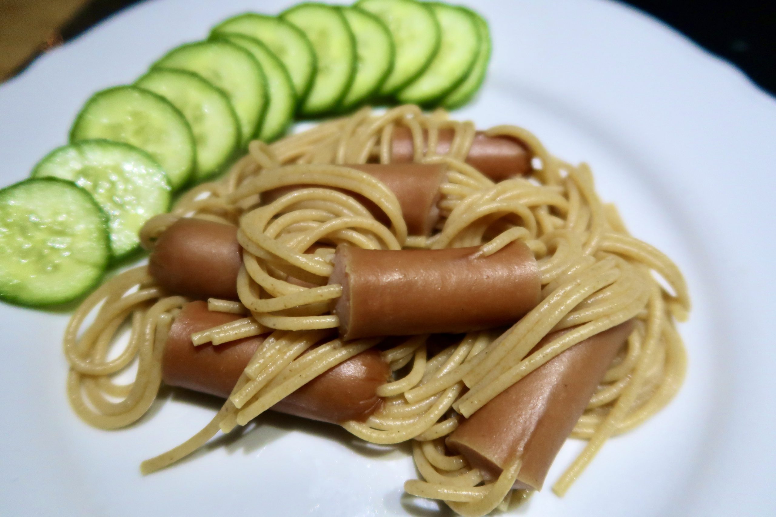 Jag minns att det första han ville ha när han kunde äta helt normalt igen var ”Gregers”. Haha… ja vi kallade denna rätten för det. Det är alltså korvbitar som man sticker spaghetti i. Sen låter man allt koka så länge som spaghettin behöver. Häromveckan lagade jag detta igen och gissa om det var kul att se hans förvånade min när han fick det serverat vid matbordet? Haha… han hade nästan glömt av det. Lika gott fortfarande dock. Här använde jag fullkornsspaghetti. Lite kul tips till någon som kanske har en liten matvägrare därhemma eller bara vill göra lite skoj av något som är så vardagligt som spaghetti och korv.
