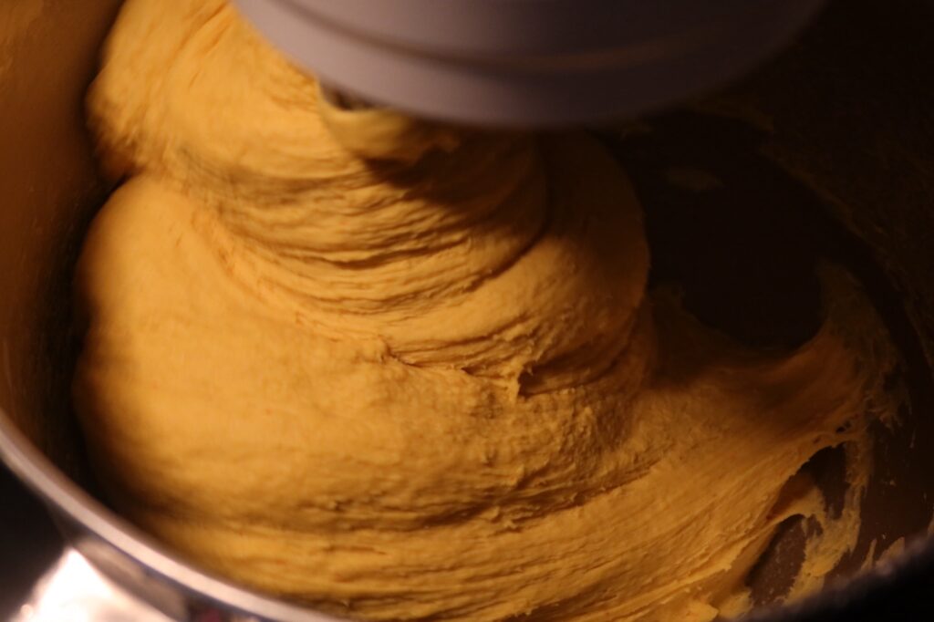2) Tillsätt mjukt smör och vetemjöl, lite i taget. Knåda degen väl. Den ska släppa från kanterna i degbunken. I maskin kör jag degen minst 5 minuter.