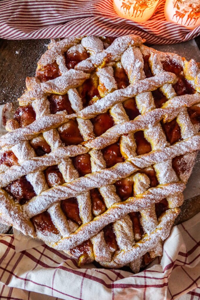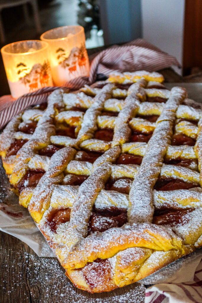 7) Bred ut marsansåsen på rektangeln som legat och jäst en stund. Lägg sedan strimlorna i en fin formation på degplattan med marsansås, förslagsvis som jag gjort. Klicka på sylten. Låt jäsa i ytterligare 20 minuter.