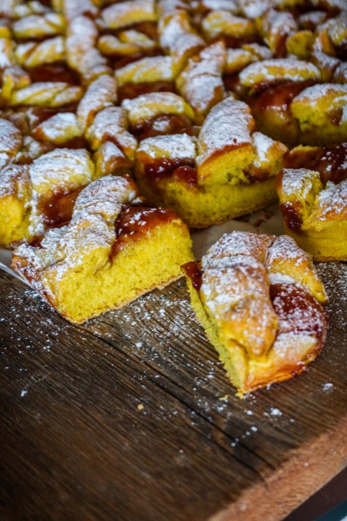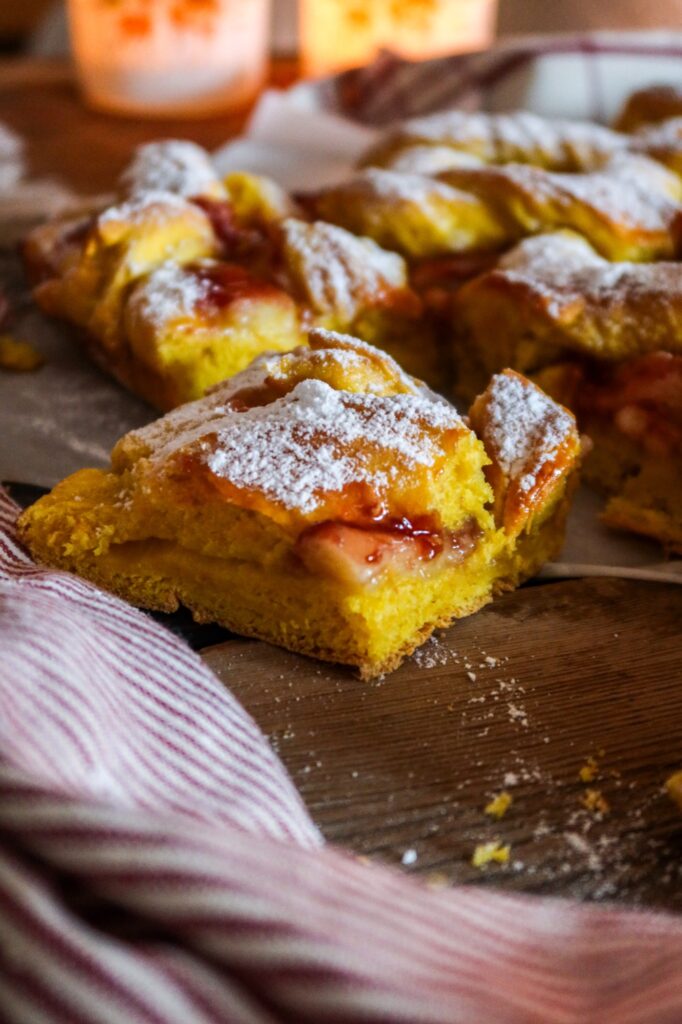 Jag har ju bakat falska wienerbröd tidigare, dock så har jag aldrig testat att göra falska saffranswienerbröd. Den här idén har jag haft ett tag, tänkte att det måste bli perfekt att göra om de vanliga falska wienerbröd till denna variant med saffran. Vet ni vad? Detta var som en fullkomlig dröm faktiskt, känns som man behöver ladda rejält för att orka ta några till kvällsfikat. 😅 Dessa saffranswienerbröd är krämiga av len vaniljkräm på första lagret. Sedan de snirliga med de diagonala över, sen ett lager med så god marmelad som jag tipsar om längre ned. Och sedan gräddas och på med florsocker. Mums!