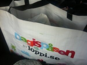 Nu ska vi åka och köpa en stoor påse godis och åka hem och mysa hela familjen. Jag är kissnödig så jag ser GULT på riktigt. Det känns som min kissblåsa är lika stor som Globen. Just nu sitter jag framåtlutad med pannan i nackstödet i sätet framför och bara biter ihop. Finns inte många ställen att stanna på här på E18. Snart kommer den här goodiebag påsen få agera toalett till mig! Herreeeeminjeeeee… Ett gupp och det är GYNATT.