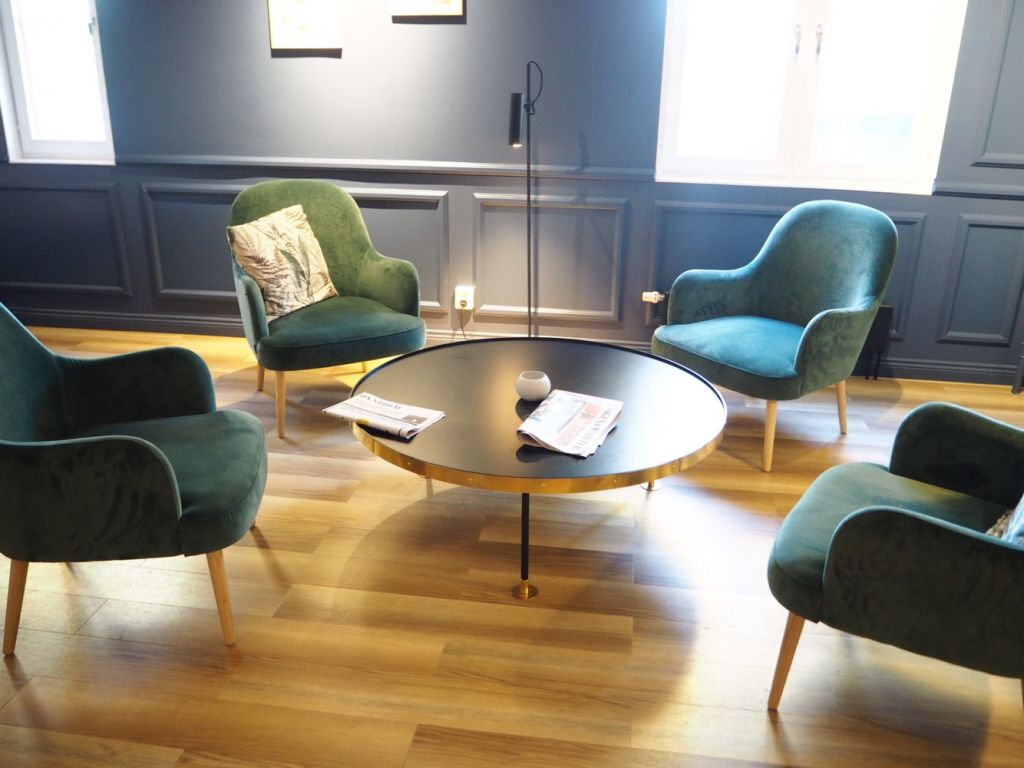 Detta murriga rum med sina blåa väggar smakfullt kombinerade med grönt, senapsgult och guld. Sen blandningen med naturella träslag till…. Sååå snyggt! Jag har förhoppningar om att kunna köra ett event där inom kort. Ska prata med chefen där och se vad hon tycker?