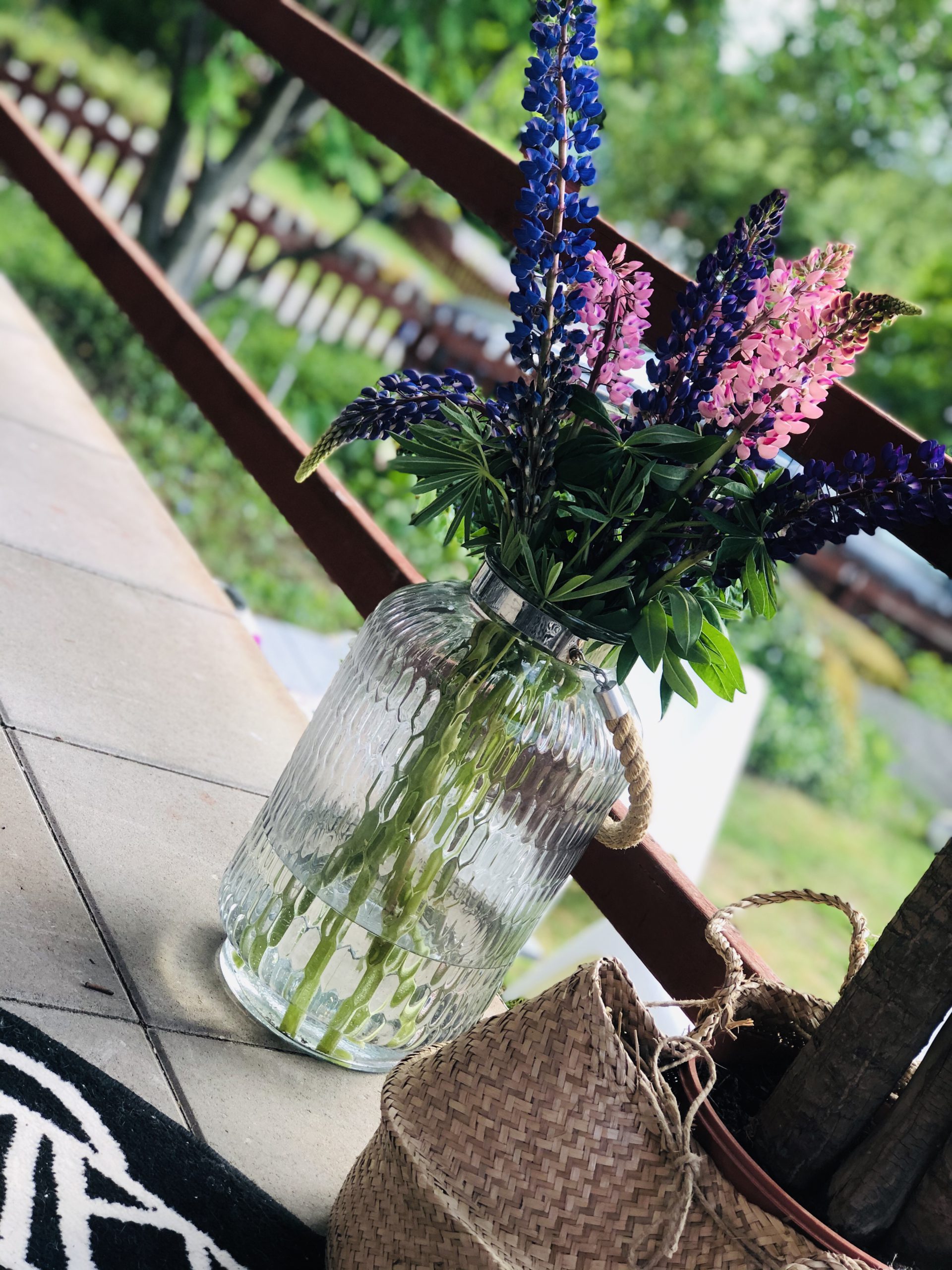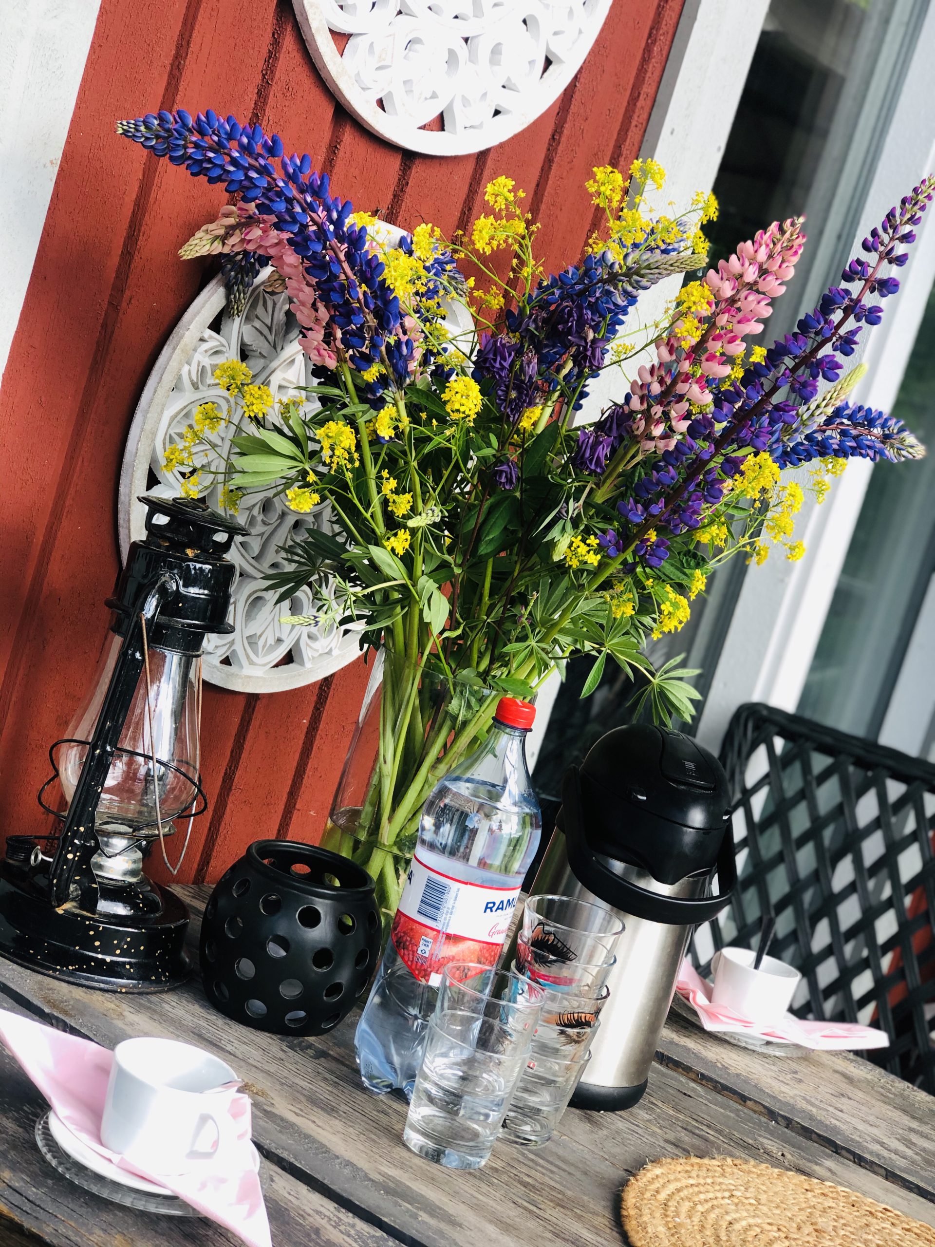 På vägen hem stannade vi till och plockade blommor. Jag ÄLSKAR lupiner och blev så glad när vi hittade ett fält med massor av dom. Väl hemma sedan så började vi duka upp för fika på altanen. Våra föräldrar skulle komma och fira sommarlovet med oss. Jag bakade en tårta efter Milos önskemål helt och hållet och kan säga att den blev en 10 poängare. Du ska få receptet på den senare idag. Så oväntad botten men som blev suuuuperbra!