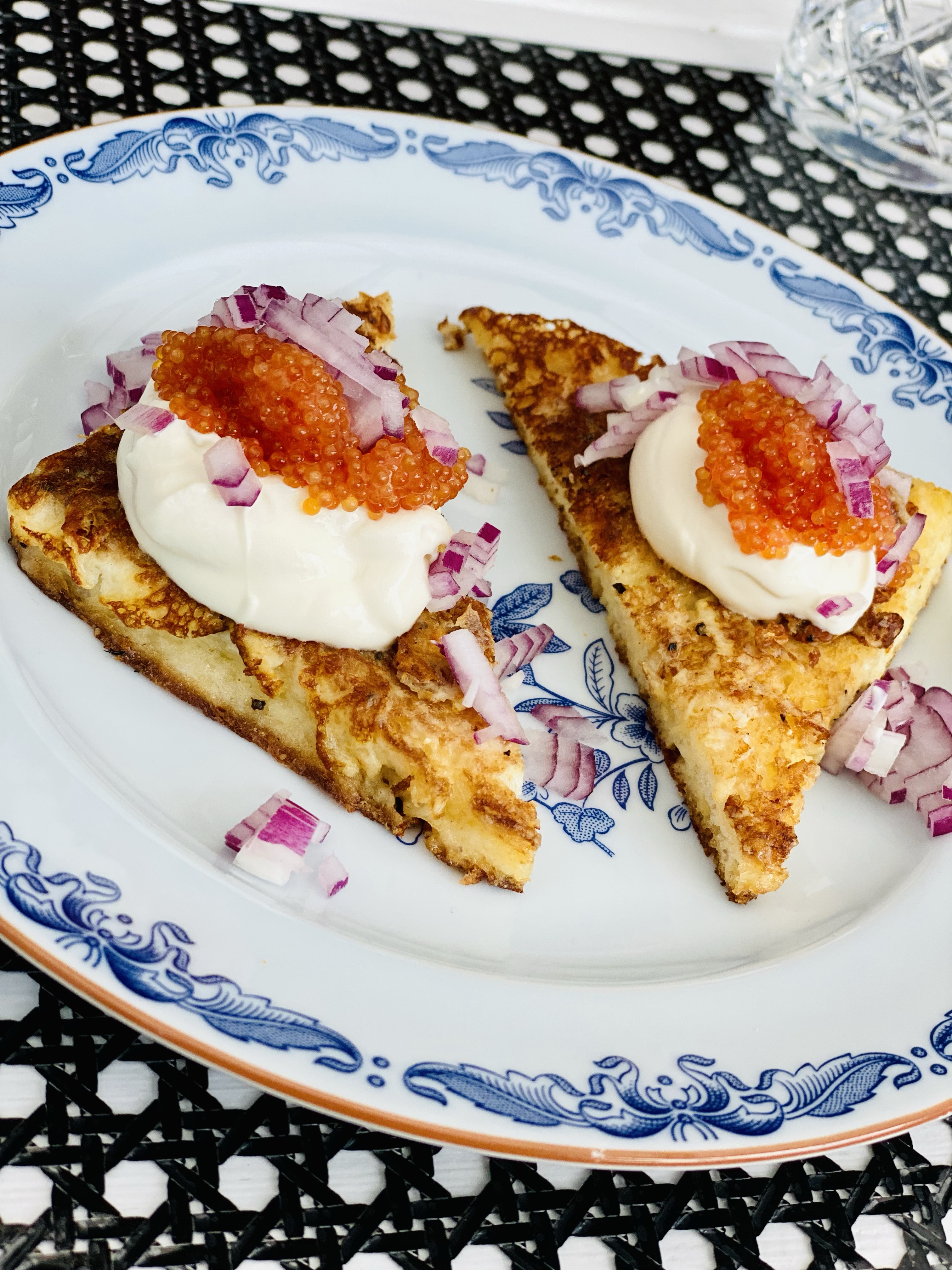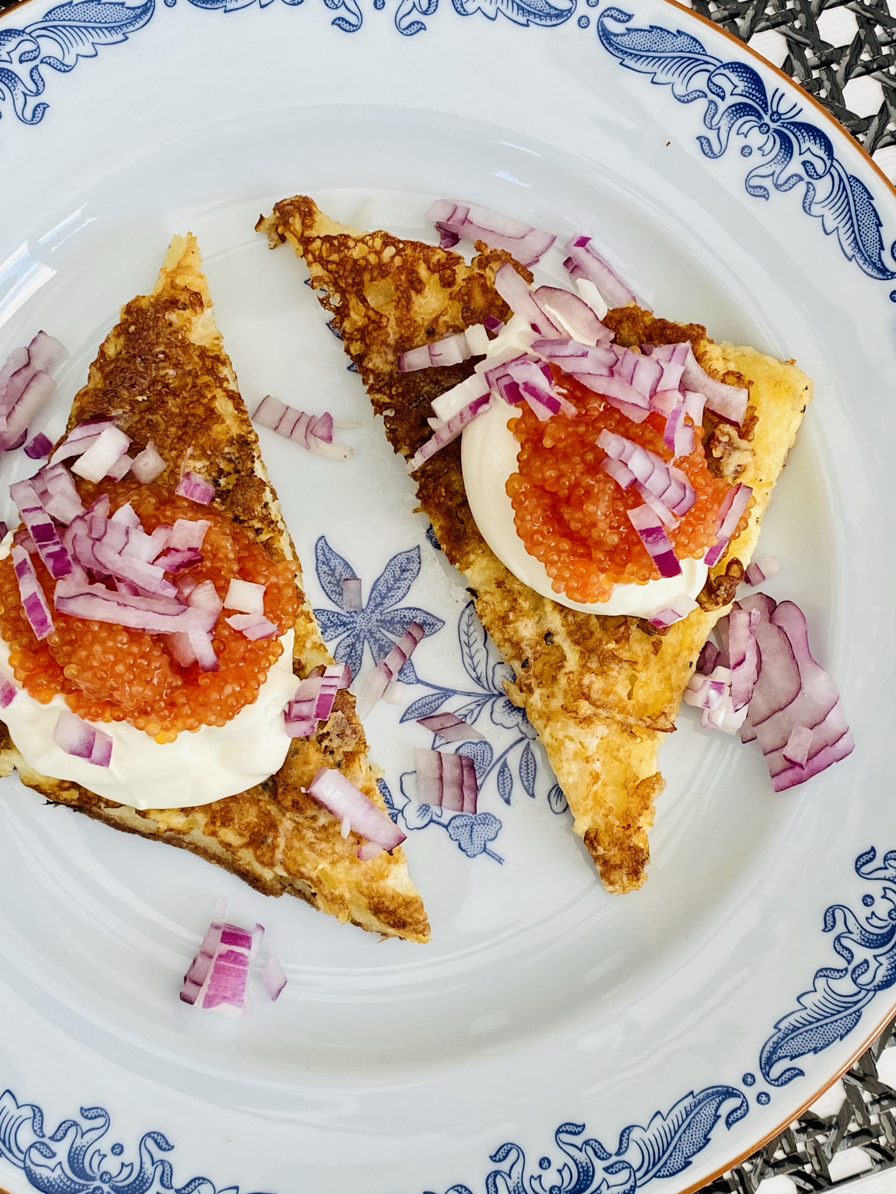 3) Lägg upp på fat, klicka på creme fraiche, rom och toppa med rödlök.