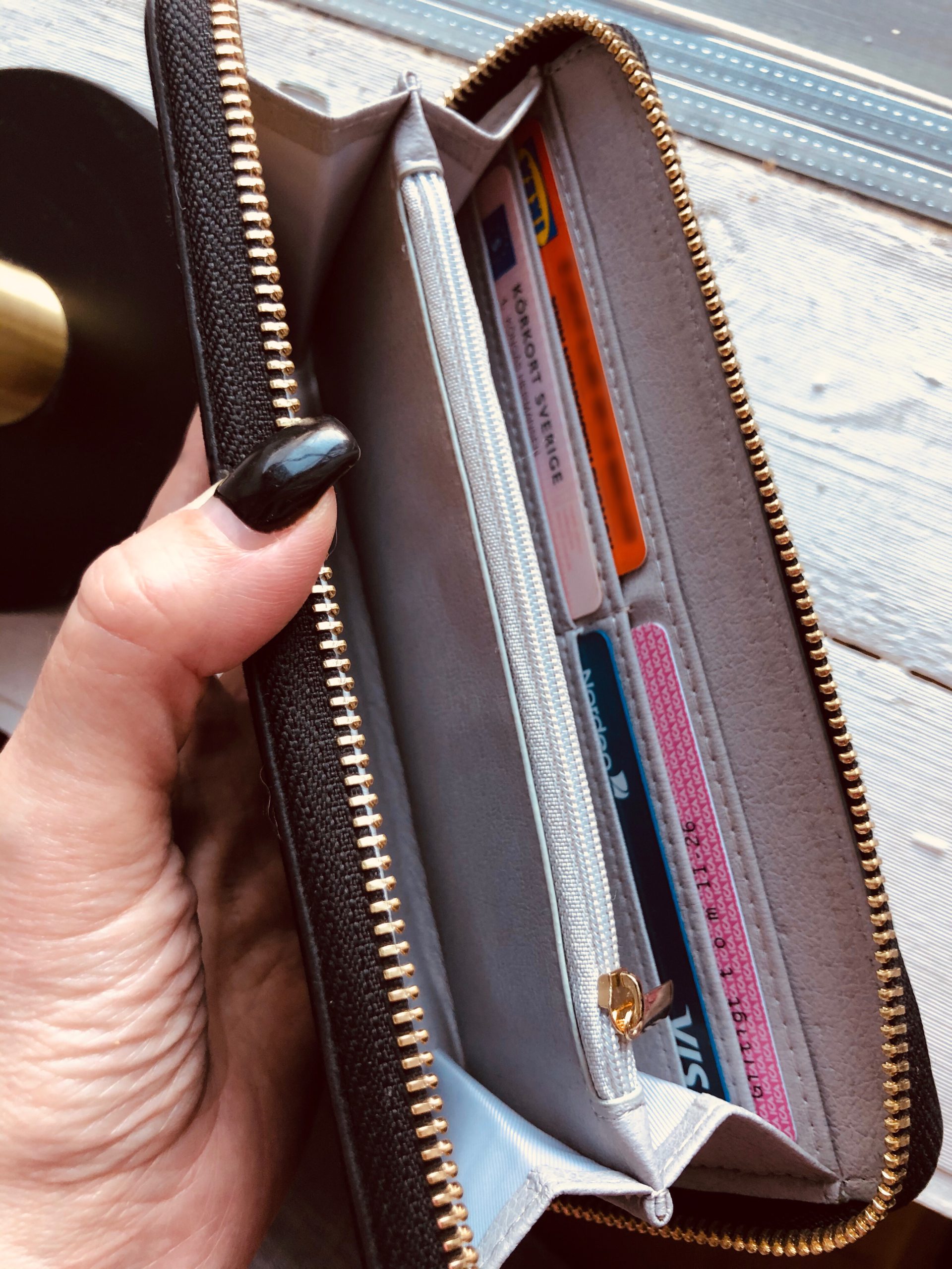 Min nuvarande >>plånbok<< (50% rabatt just nu) är den här, jag älskar den. Har plats för min stora mobil, alla kort och även mynt. Snygg att bära bara som den är också, guldkedjan gör den som en liten väska. Kedjan är förresten avtagbar.