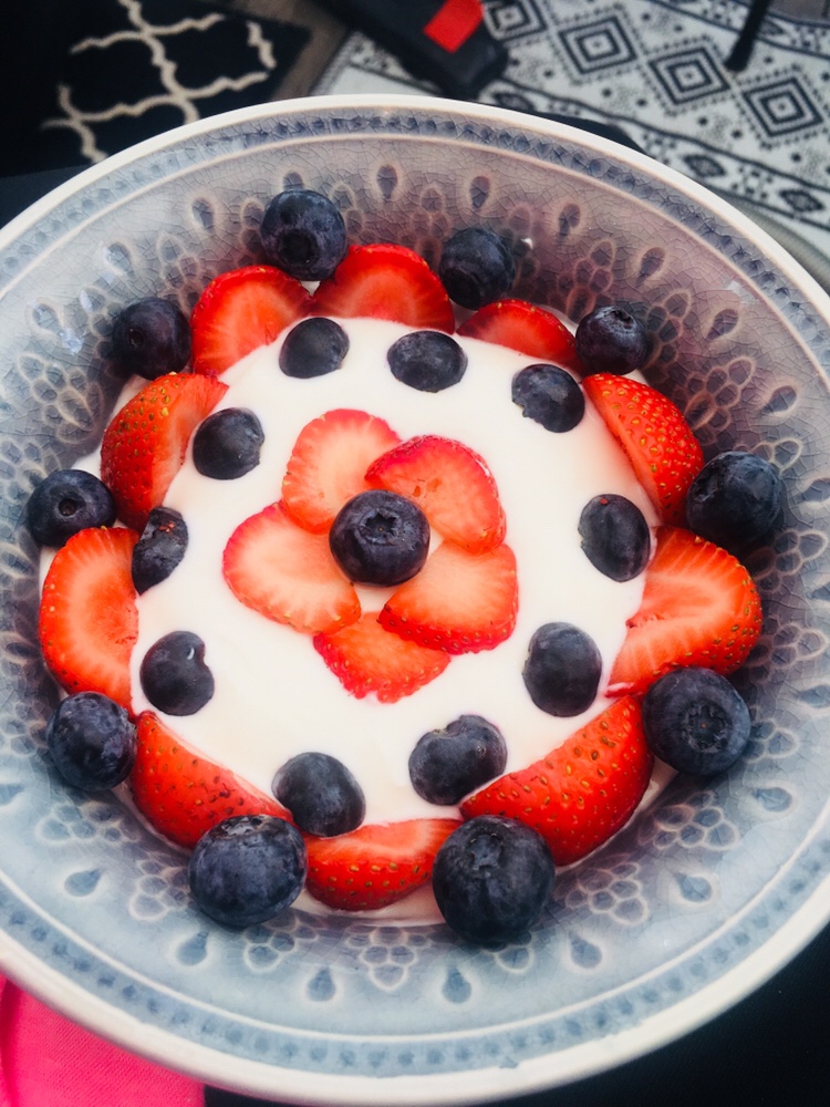 Efteråt blev det gofrukost på altanen. Jag drack också lite vätskeersättning och massa vatten. Gofrukosten är kvarg och turkisk yoghurt blandat, sen ska det vara svenska jordgubbar och blåbär uppepå!