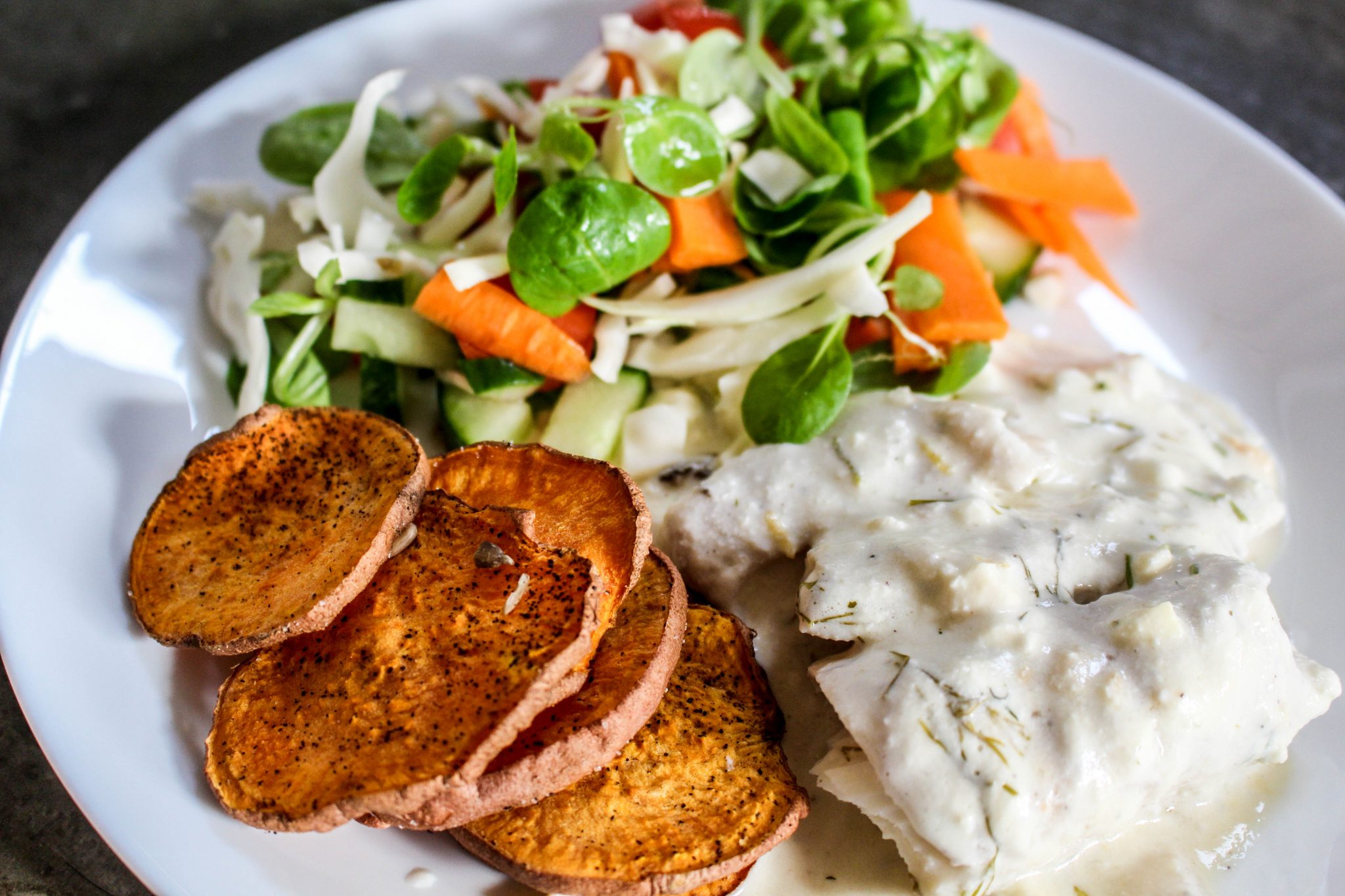 4) Smula i fetaost i blandningen. Rör runt med en visp en stund så det blandas samman ordentligt. Det får gärna vara lite smuligt i röran, det gör ingenting. Häll blandningen över fisken. Tillaga på 225 grader i ca 30 minuter. Servera med sötpotatischips och en grönsallad.