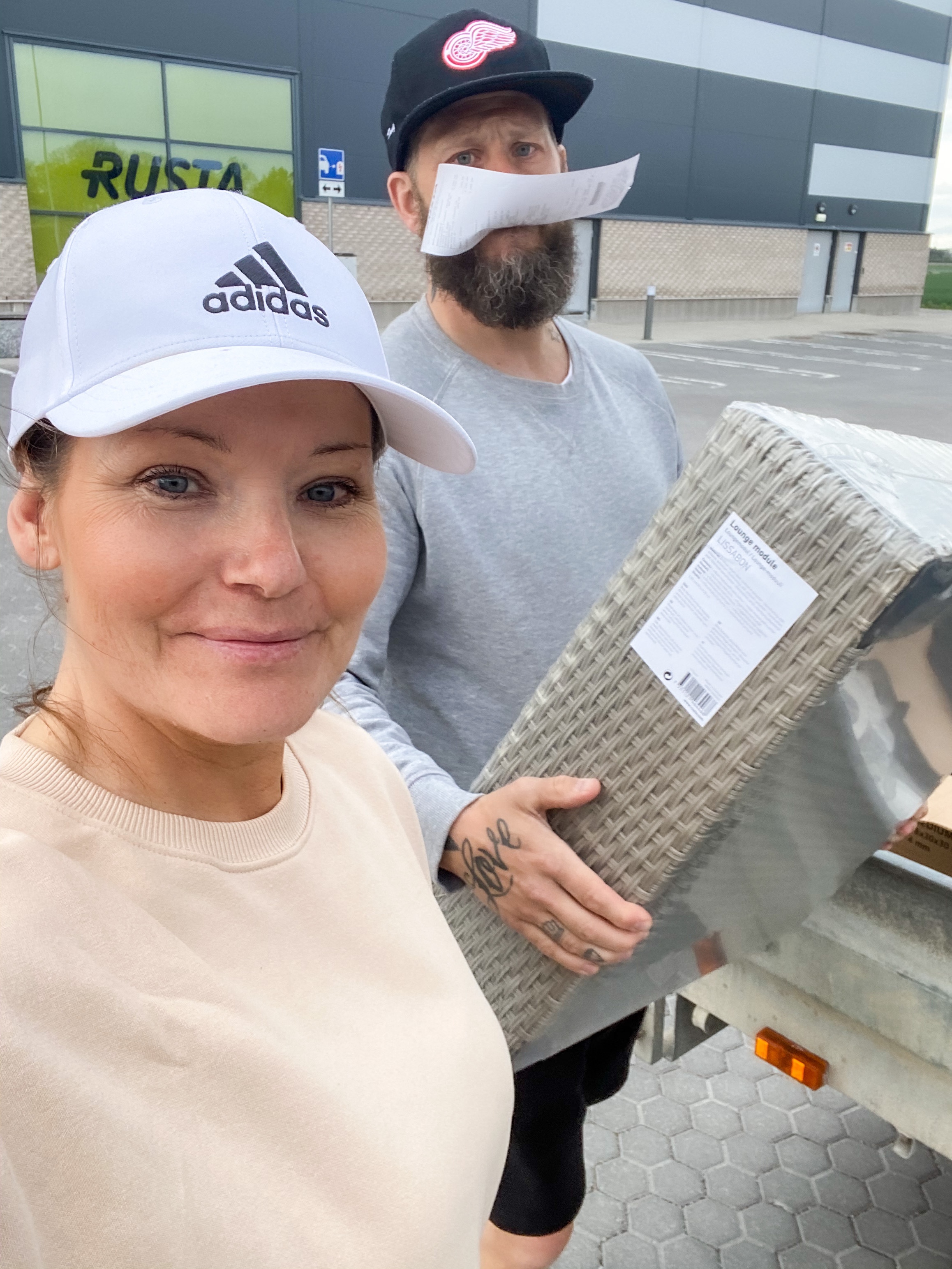 Glad i hågen på väg in på Rusta på vägen hem från Thedde igår! Som tur var så fick vi plats med lite loungemöbler i släpkärran.