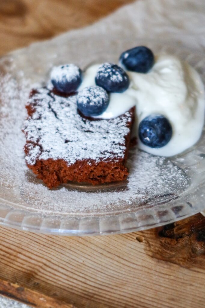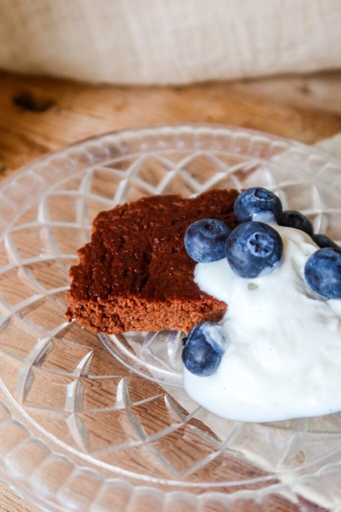 Här åt vi den tillsammans med vaniljkvarg och några färska blåbär. Så himla gott till en kopp kaffe! Tony pudrade på lite florsocker på sin, vill ej att det ska vara ”nyttigare” så välj ett sötningsmedel som kan pudras.