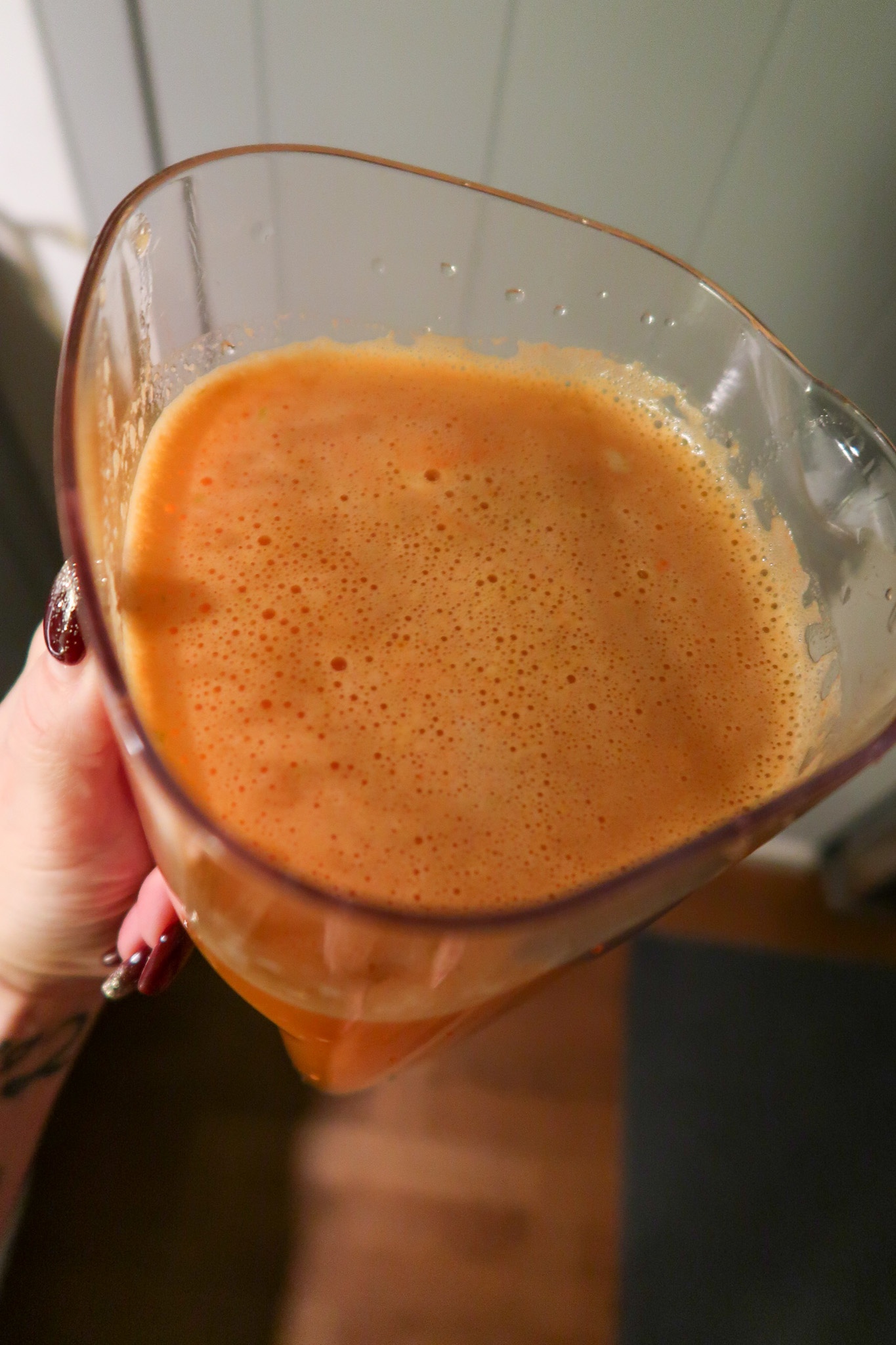 - Skala alla frukter & grönsaker (ingefäran behövs inte), dela i mindre bitar och kör i en råsaftcentrifug eller juicer.