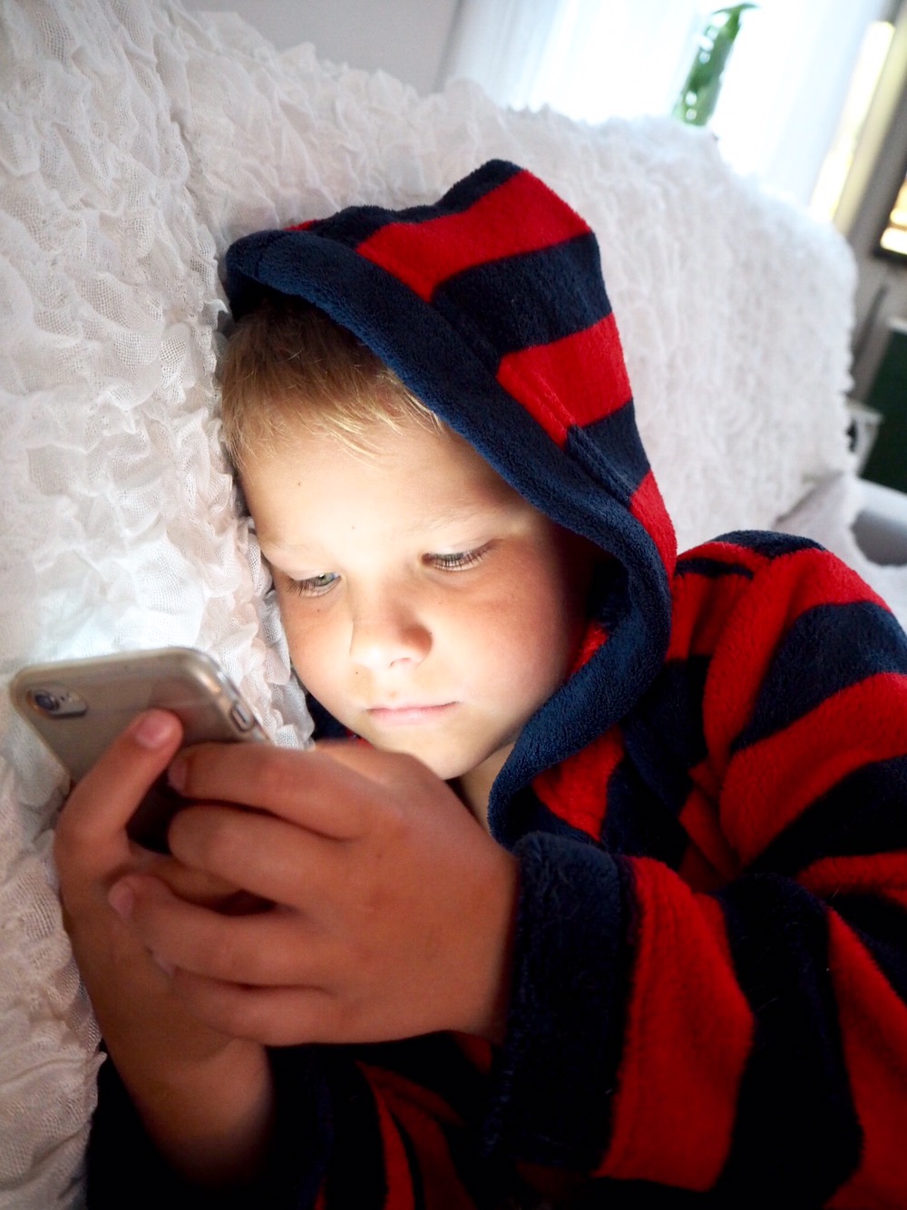 Den här sötisen är nyduschad och har en stund med luren. Ja, det blir sena kvällar och sena morgnar för honom, så nog har han sommarlov allt.