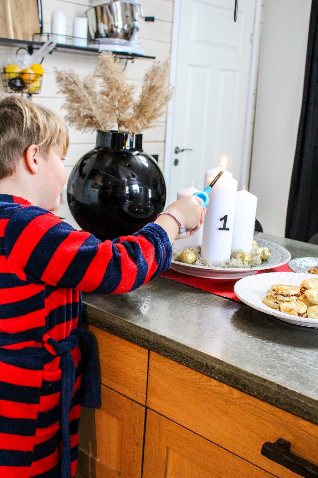 Traditionsenligt så tände Milo det första ljuset. Han stackars är så otroligt förkyld så han har fått stanna hemma idag och sover faktiskt fortfarande. Igår hasade han runt i sin morgonrock hela dagen, han är en livsnjutare deluxe precis som sin mamma. Hasa i morgonrock en hel dag kan vara det härligaste. Men fråga mig dag 3, då vill man bränna upp den jäkla morgonrocken på bål. Haha….det måste vara lagom av allt.