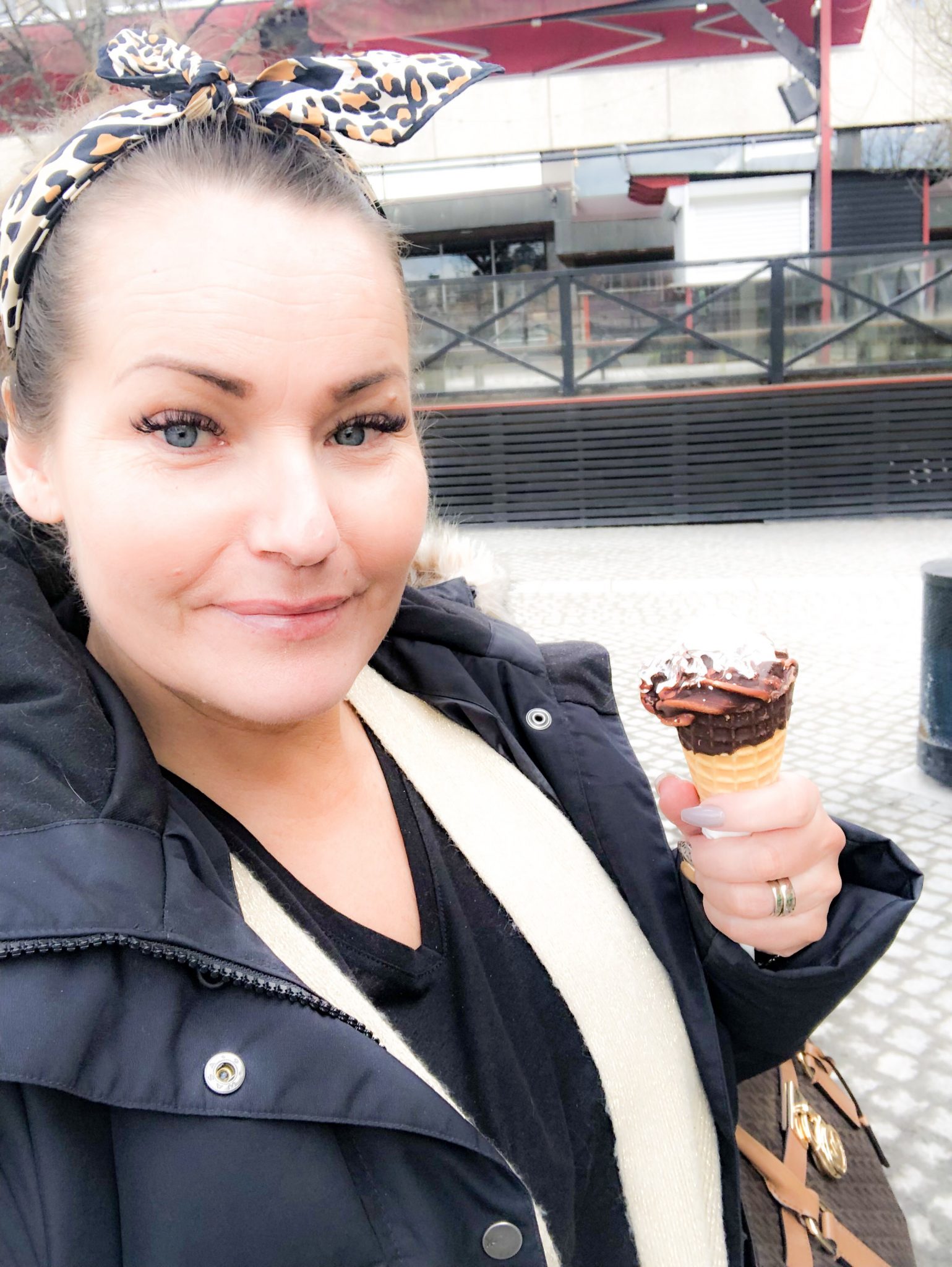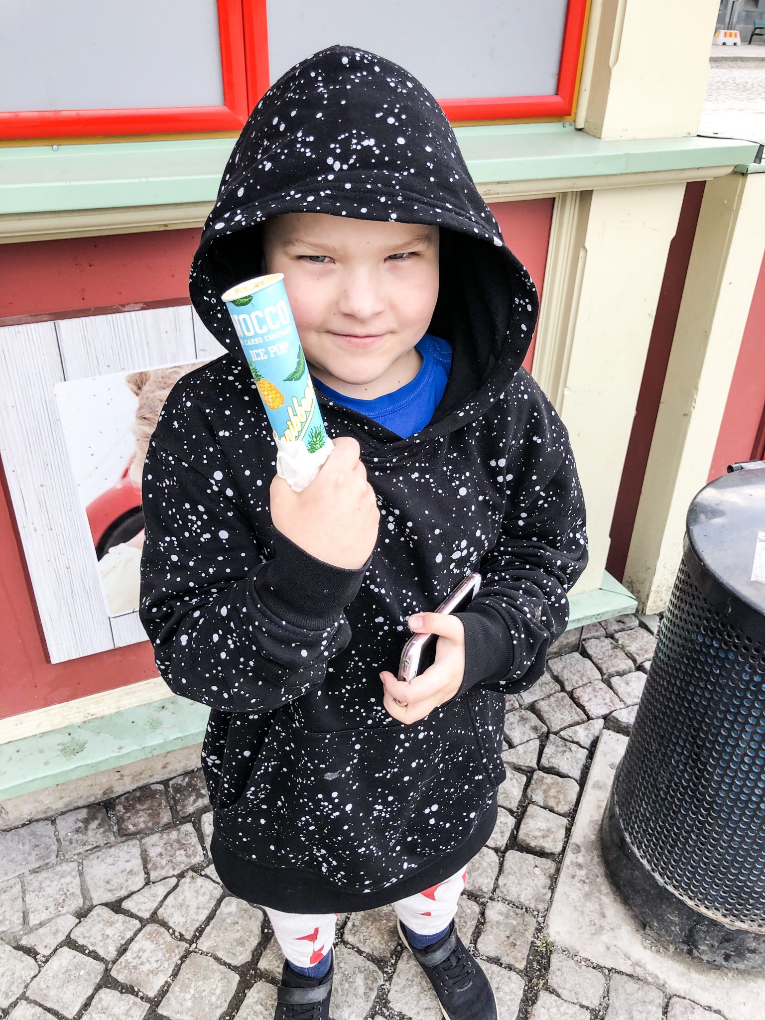 På eftermiddagen idag fick Milo gå ut och lufta sig lite. Han är redo för skolan imorgon då förkylningen blivit bättre. Jag åt min första mjukglass för året. Glutenfri våffla och låglaktosglass bjuder torggrillen på här hemma i småstaden. Sånt LYX! På min mjukglass är det nästan alltid chokladdopp. Godaste i världen!