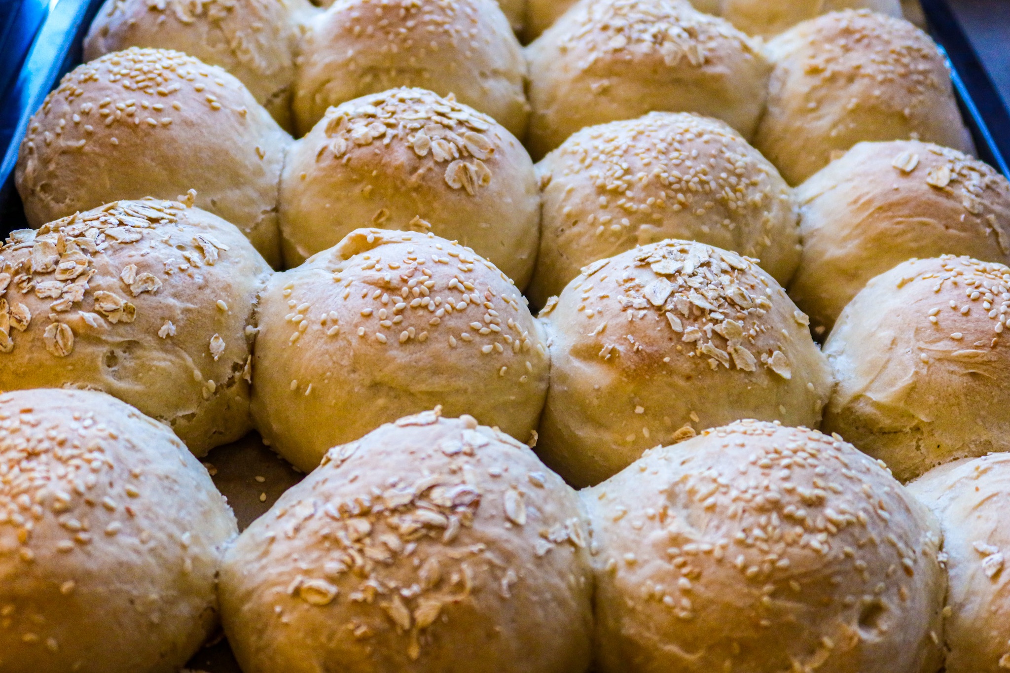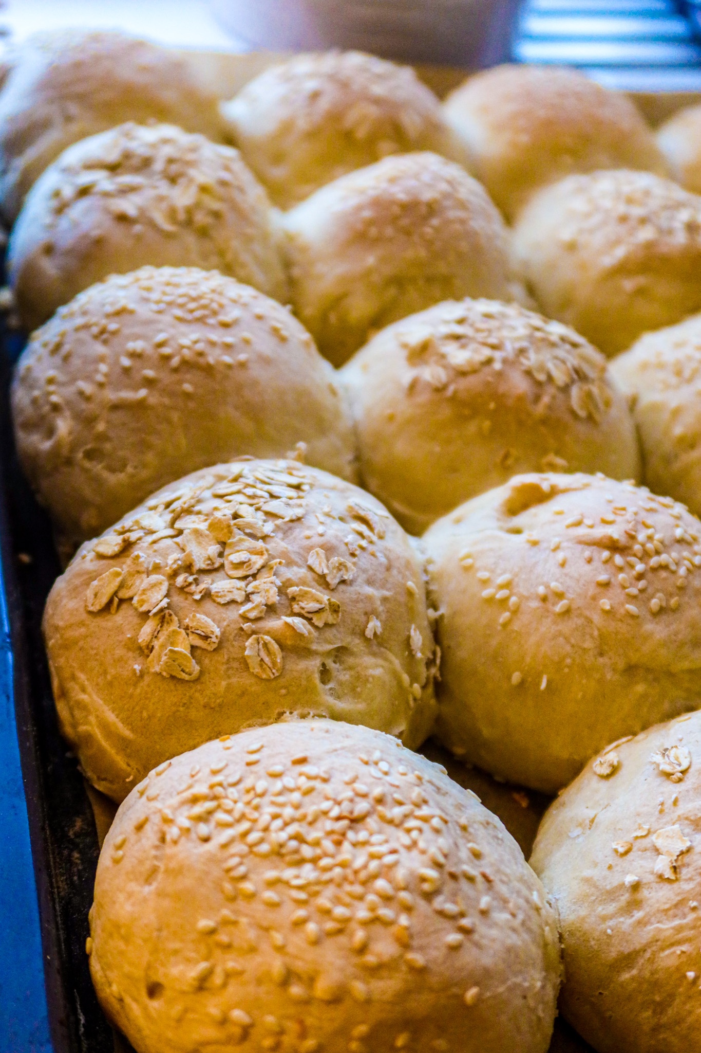 8) Blanda vatten och sirap och pensla bullarna. Strö på sesamfrön och havregryn uppepå. Igår använde jag bara vatten, men för färgens skull ha i lite sirap.