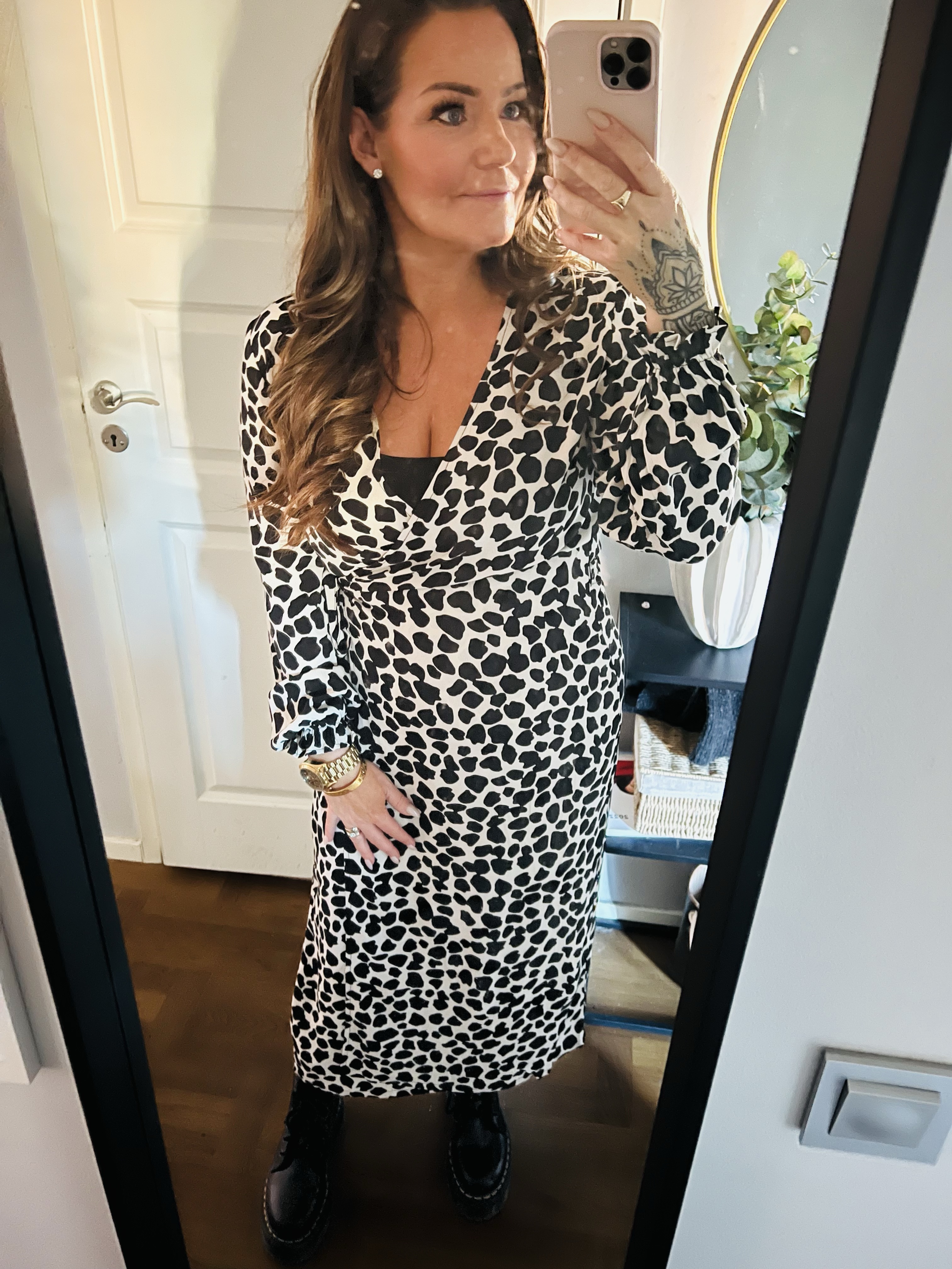 Klänning HÄR. Världens skönaste omlottklänning i härligaste materialet. Gillar hur det faller. Stortrivdes i min outfit igår.