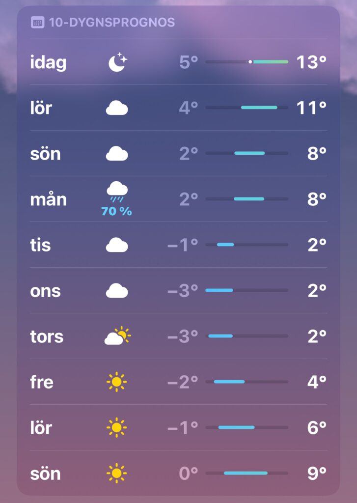 Blir en lugn helg här hemma. Ska försöka komma ut på en liten promenad (om ryggen tillåter), fixa i ordning lite vårigt hemma, vet ni…. Jag tror att utemöblerna ska få flytta fram i helgen. Idag ska det vara 13 grader och imorgon 12. Är så taggad att kura in mig i en filt om vädret tillåter och sitta och dricka kaffe på altanen. Tänkte på nästa helg också, vi är ju inte hemma, vi ska på begravning i Finland men ”Mellan” som ska vara hus & kattvakt kanske vill sitta ute han också. Det ser ut att bli toppen väder nästa helg! Jag ska också baka något riktigt gott. Har en idé på en lyxig kaka som jag tror kan bli en ny favorit. Får se om den blir så bra som jag tänkt!