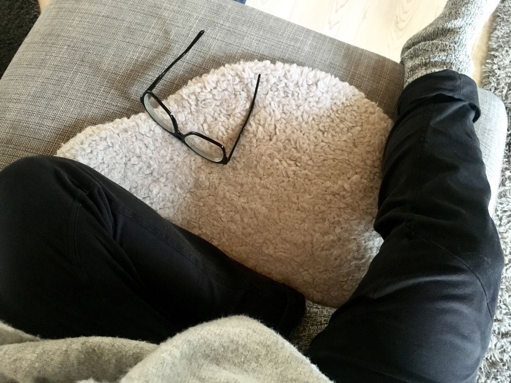 – Sitter i mamma och pappas soffa, kutad rygg i halv skräddarställning (som jag nästan alltid gör så jag somnar i ena benet). Har just ätit och är proppmätt.