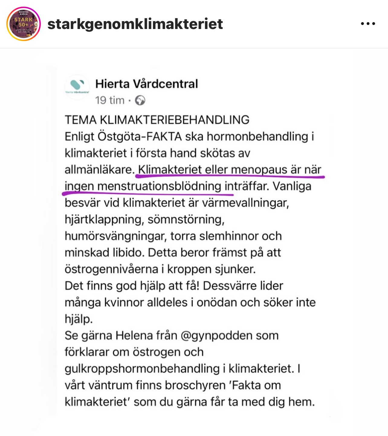 Har haft lite strul med att hitta rätt dosering av min progesteronkräm så klimakteriet slog till som ett jäkla blixtnedslag i veckan. Hade t.o.m. panikångestkänslor vilket jag inte haft på åratal. Det sjuka är att samma dag som jag haft det så skrev en följare om sitt klimakterie och att hon t.o.m. hade fått panikångestkänslor. Det var en lättnad för mig, då känner man sig normal i det onormala. Kan verkligen varmt tipsa dig om att följa kontot: ”Stark genom klimakteriet”, Instagram HÄR. Bilderna här ovan förklarar kvinnohälsan som råder just nu så himla bra. Hämtat väldigt mycket kraft och tips från hennes sida. Det har t ex blivit dag för mig att kolla hur jag ligger till i mitt klimakterie nu, förmodligen behöva även östrogen nu. Fortsättning angående det följer….