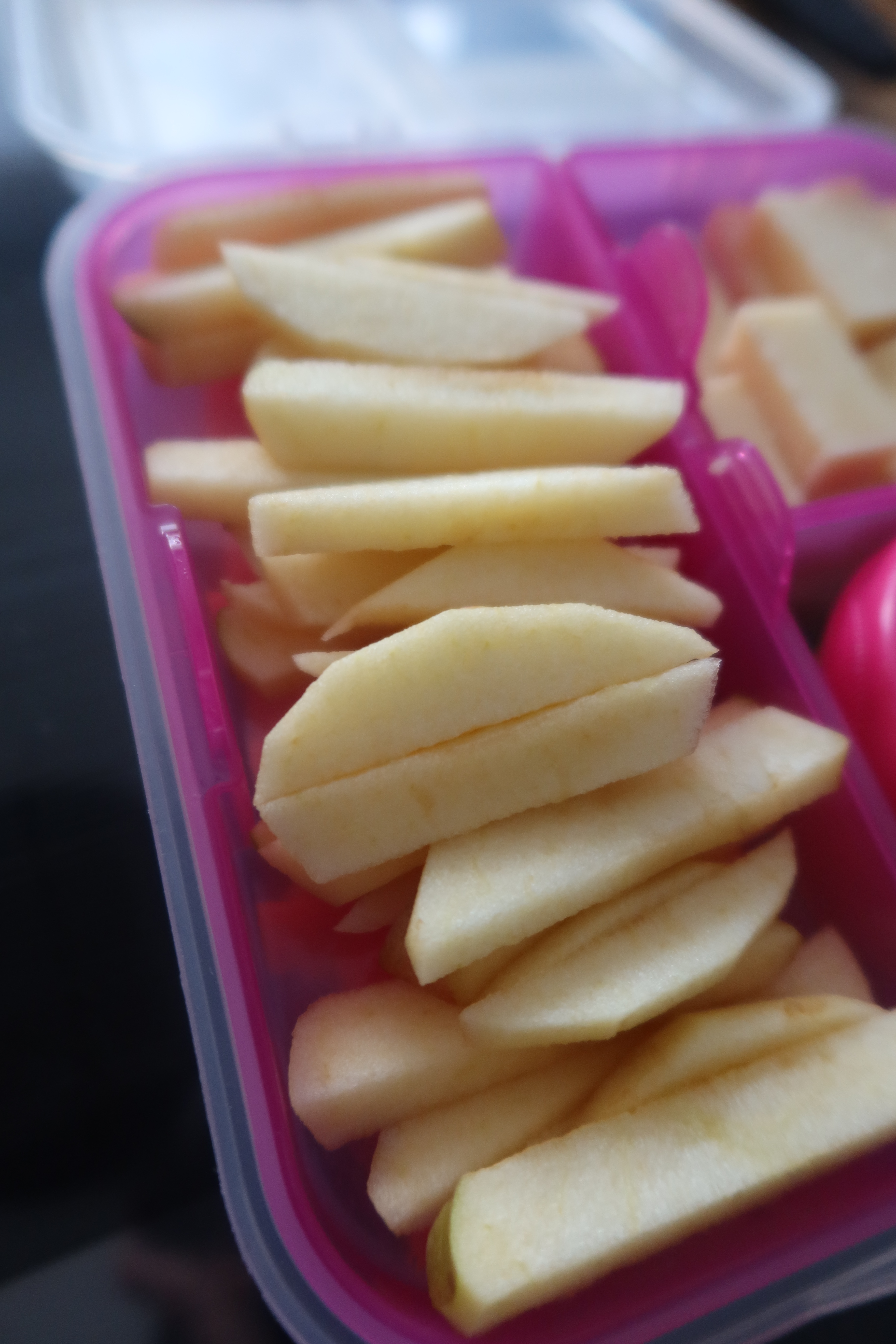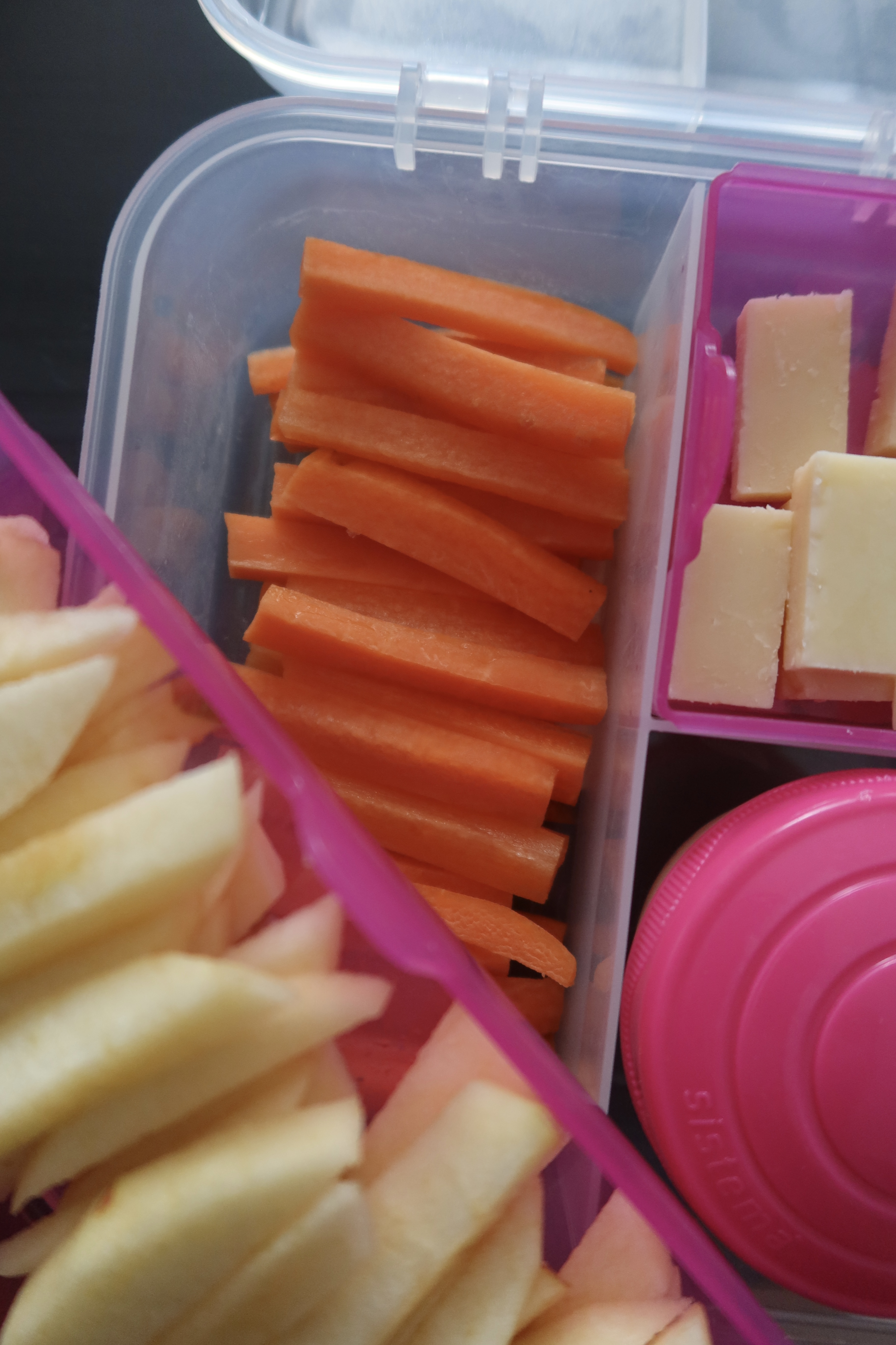 Den här beställde jag på Amazon. I den här Mellisbehållaren hade jag i äpple- och morotsstavar med en hemgjord dipp på yoghurt, sweetchilisås, vitlökspulver och salt. Sen hade jag i ostkuber och skinkbitar också.