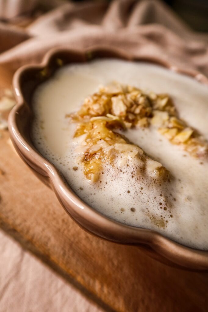 Har du inte testat semmelgröt tidigare, omg då måste du. Detta är så gott så man ramlar baklänges alltså. Det är som att äta en alldeles fantastisk efterrätt. Jag brukar också klicka i en stor klick med mandelsmör(<klicka – har du inte testat tidigare så MÅSTE du, supergott i yoghurttallriken med müslin också).