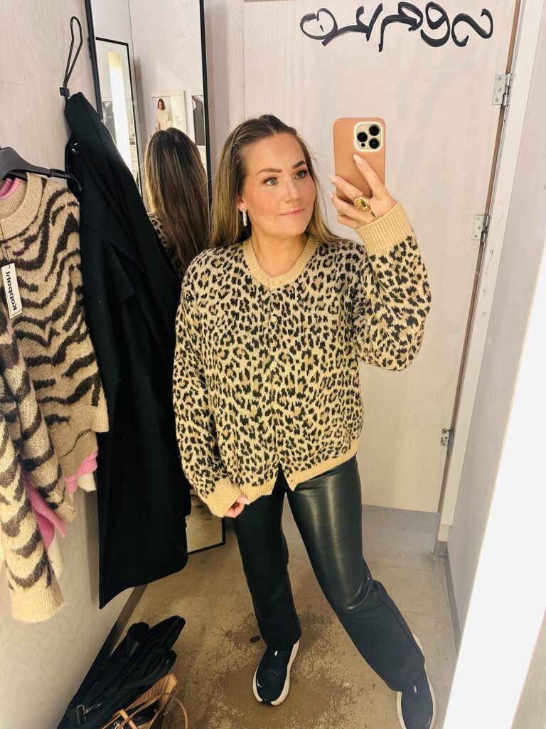 Så fin stickad leopardkofta, alltså jag och djurmotiv kommer alltid att gå ihop! Så enkel att styla med snygga svarta brallor t ex! Du kan också ha den öppen och ha en snygg blus eller topp under. En garderobsräddare!