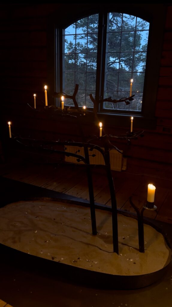 I förrgår besökte vi Sälen kyrka. Så vacker liten fjällkyrka där jag fick tända ljus för de som inte längre finns på jorden. Min moster Aino, Erik m fl. Så saknade människor. Jag saknar min moster så det inte är klokt, för att rädda mig själv från att tänka att jag aldrig mer ska få se henne, krama henne eller prata med henne så tänker jag att hon finns. Att hon bor där i sin lägenhet i Sthlm och att vi ska höras snart. Men, nu, sakta sakta, börjar den där poletten liksom trilla ned…. Jag inser mer och mer att hon verkligen inte finns, att jag verkligen inte ska få träffa henne här på jorden. Det var skönt att få sitta där och liksom känna någon form av samhörighet med henne, det känns verkligen som om hon är med mig, även om hon inte finns här så kan känna hennes närvaro. Det blev en fin stund i kyrkan.