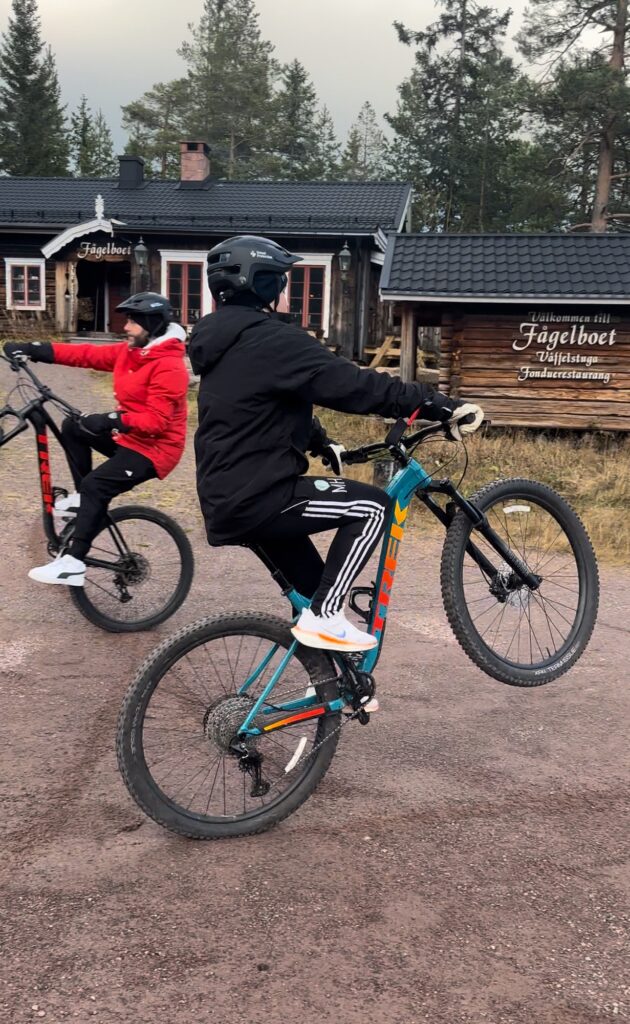 Skrattade så jag nästan kissade i brallan av den här bilden. Här höll de nämligen på att försöka bräcka varandra med att cykla längst på bakhjulet. Att skratta gör gott för oss, det vet du va? Frigör endorfiner så det bara står härliga till.