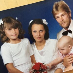Apropå familj, detta är min rotfamilj och året är 1982. Det är juni och vi är i norra Finland och mamma och pappa ska gifta sig. Jag var så spänd. 9 år var jag och skulle fylla 10. Mamma hade sytt sin klänning och blommorna på min tröja hade hon sytt dit. Jag tyckte min mamma var så otroligt vacker och jag minns att jag ville gråta i kyrkan. Åh, lilla Nina och lilla lillasyster. ❤️