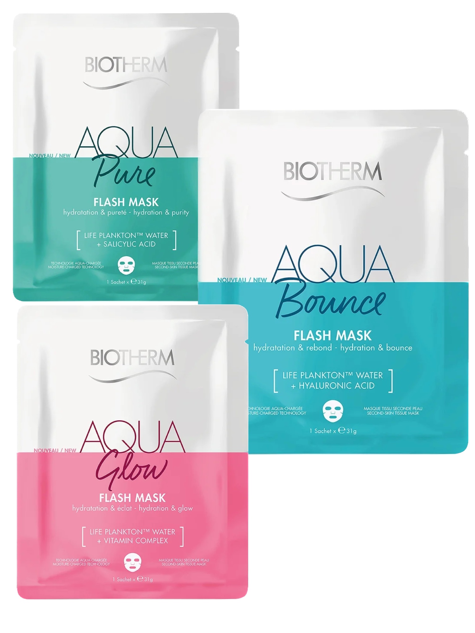 Finns i 3 olika varianter, du kan köpa alla i ett paket HÄR (<klickbar länk). Aqua Pure (intensivt återfuktande, håller huden ren & fräsch med salicylsyra), Aqua Glow (intensivt återfuktande, ger lyster med Vitamin C komplex), Aqua Bounce (berikad med hyaluronsyra som ger huden spänstighet & lyster).