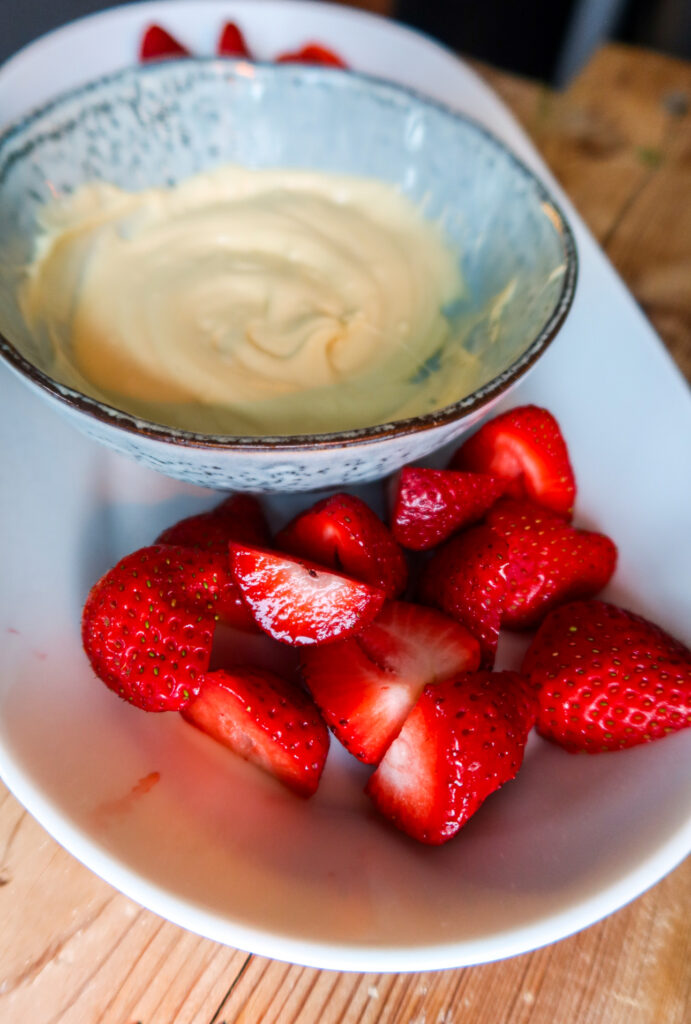 Jag blev nyss serverad detta vid sängen, lite gottigt mellanmål nu när den här dagen inte riktigt blev som tänkt. I skålen är det smält vit choklad.