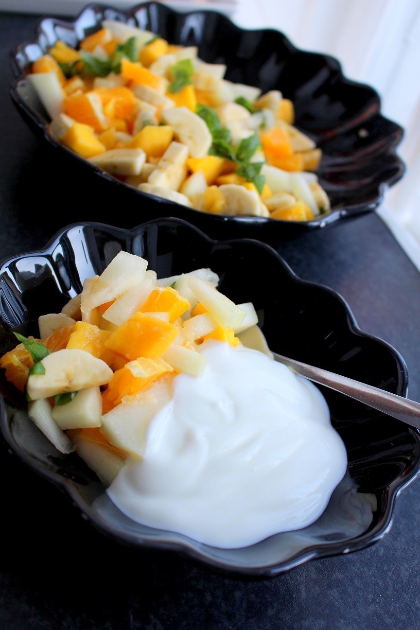 Alltså basilikan gör UNDERVERK med en vanlig fruktsallad alltså. Smaken är het underbar. Jag åt detta till naturell yoghurt och det är såååå gott.