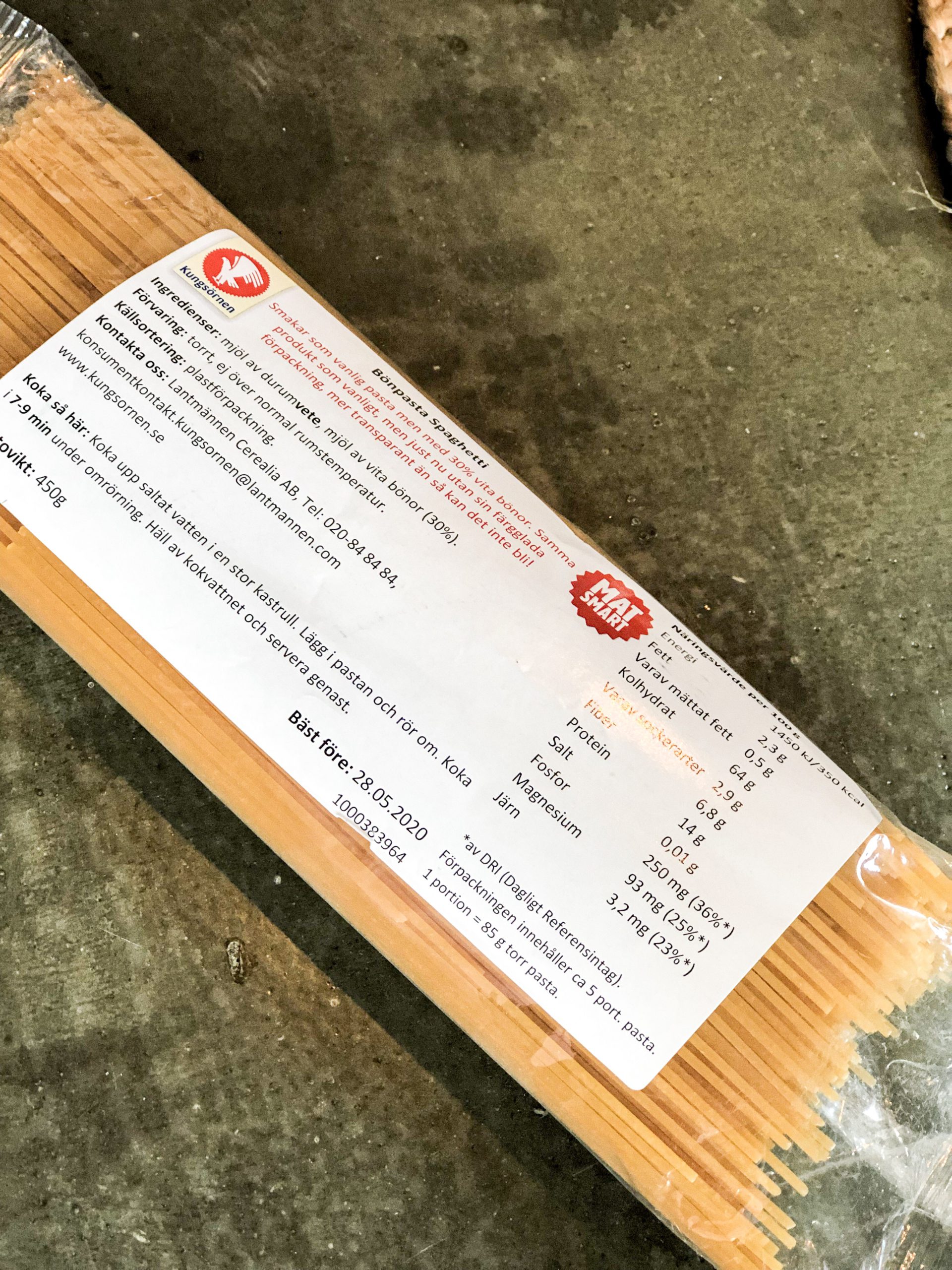 Som den här pastan från Kungsörnen. Det enda som är fel är att det blev fel i produktionen när spaghettin skulle få sitt tryck. Det är alltså sprillans ny och bra pasta från Kungsörnen, bara att etiketten inte ser ut som den ska, inget annat.