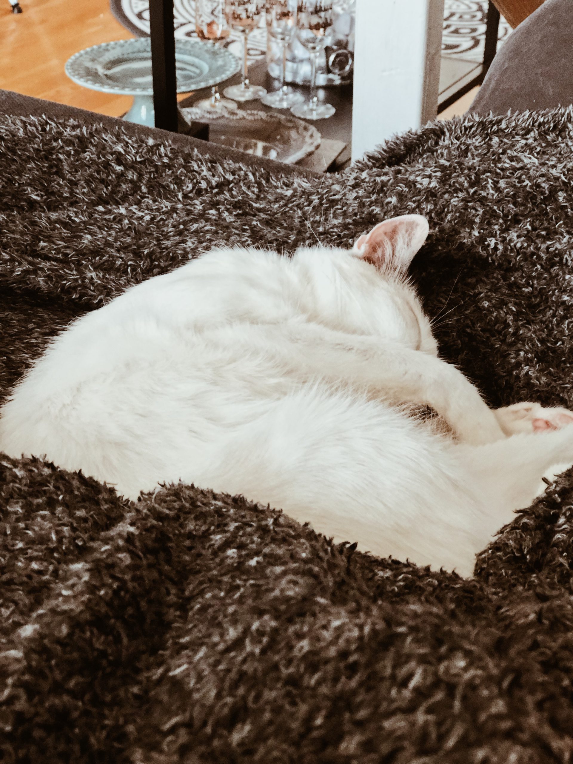 Jag dricker lite grönt te med havremjölk i och vilar mest på soffan idag. Är glad att jag har den här hårbollen bredvid mig som värme och sällskap.