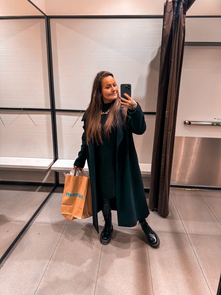 Stickad tunika med slits (REA) // Coatade leggings // Kängor (REA) // Kappa (REA – kom igång rabattkod NIIINISNOV24 som ger 7% extra på rean, och 33% på dyraste varan. //