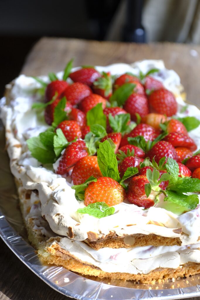 Och vet du, allt blev så himla bra. Den nya botten jag testade blev så saftig och fluffig, marängen blev frasig men ändå seg inuti… och jordgubbsfluffet, alltså… krämigt, bärigt, sötsyrligt.